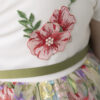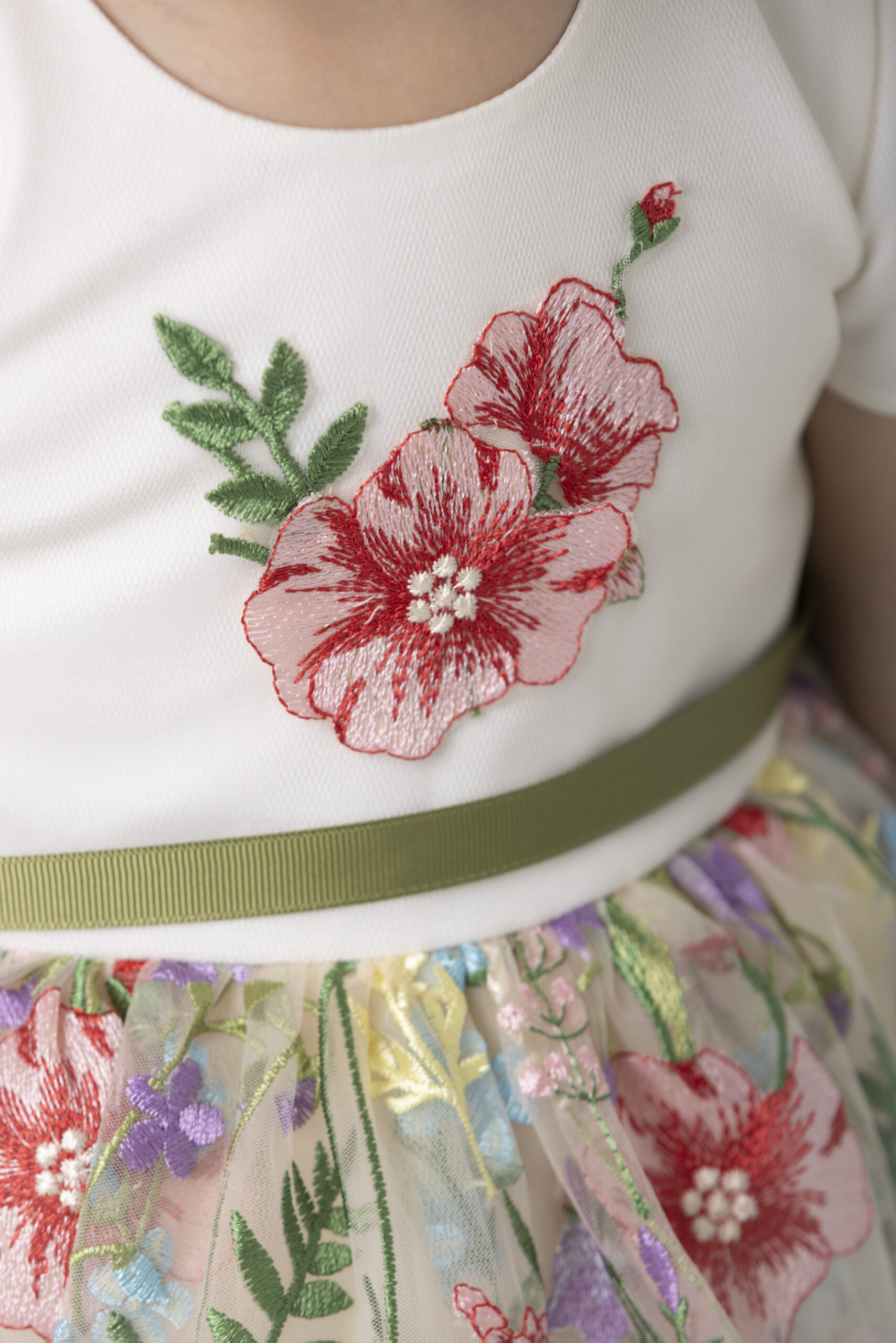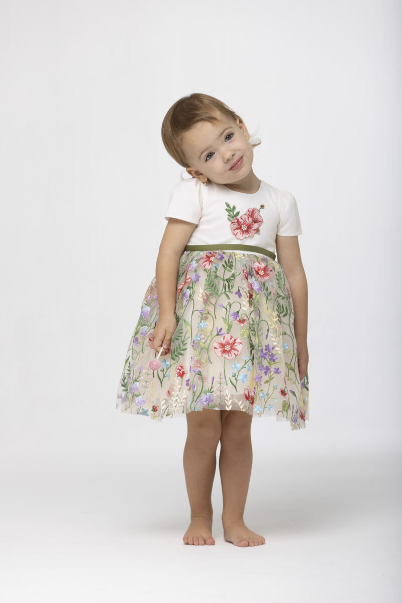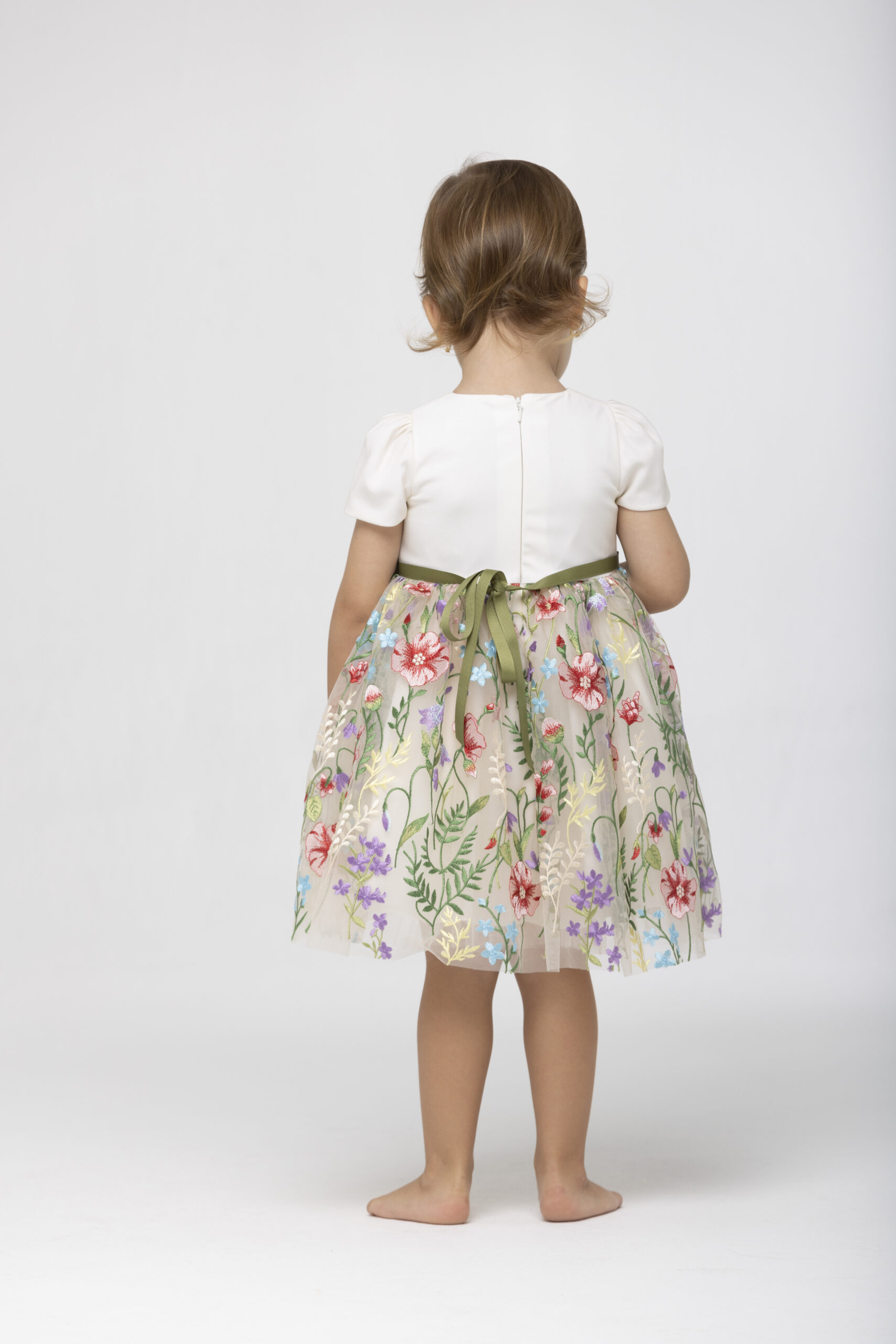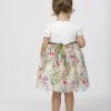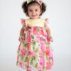 Beautiful pink dress for baby girls by Speranza, with a lovely multicolor hydrangea print. Made in lightweight Chiffon, it has a butterfly pleated sleeves and a small bow on the neckline. The dress is comfortably lined in lightweight cotton and fastens with a zip on the back.