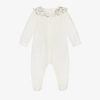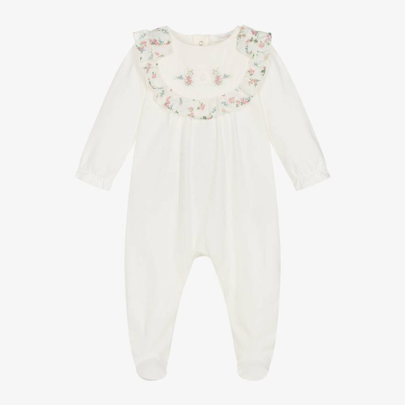 So pretty for girls, this ivory babygrow from traditional Portuguese brand Patachou is made in super soft cotton jersey with a gentle feel against the skin. It has beautiful floral-patterned Liberty print trim and a soft woven bib insert with matching embroidered flowers. Â Sweet gathers create a relaxed fit and the babygrow has puffed sleeves with elasticated cuffs. There are poppers to fasten on the back and between the legs, and a little logo charm on the front adds a branded touch.