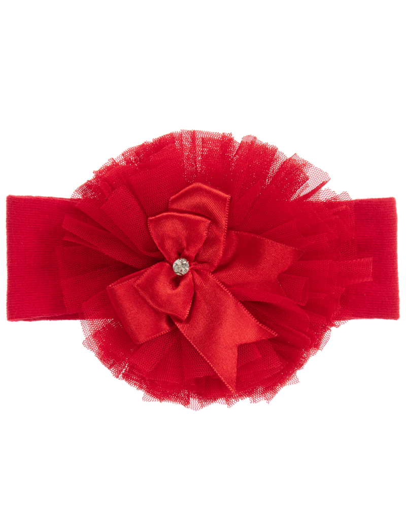A soft and stretchy red headband for baby girls by beau kid. It has tulle and a ribbon bow detail, with a sparkly diamante in the center.