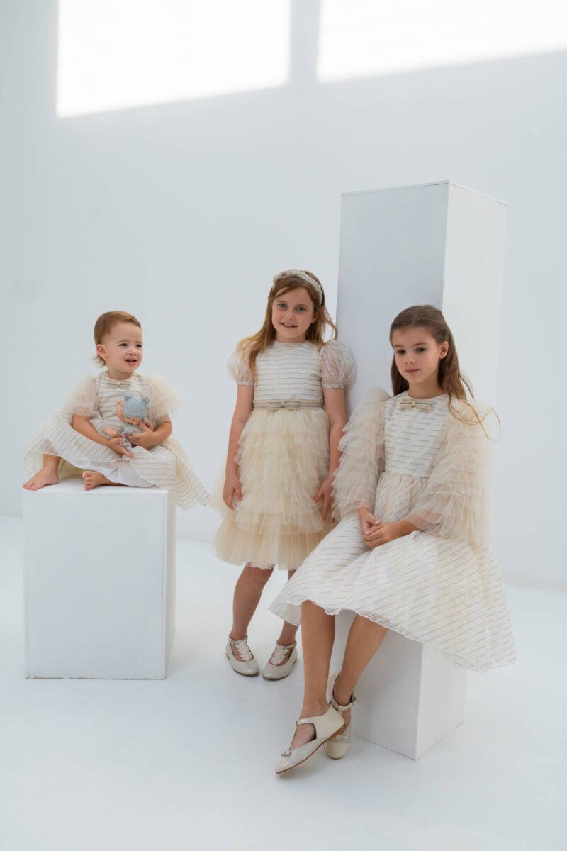 An ivory special occasion dress for girls by Speranza. Made in a stripe organza and layered tulle on sleeve and beige trim with crystal