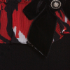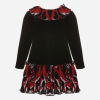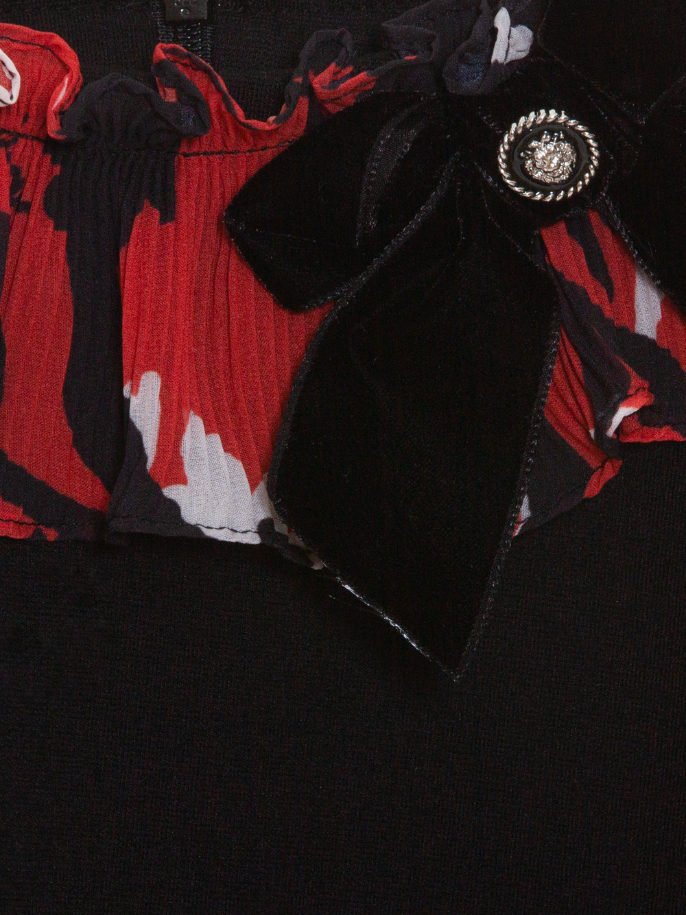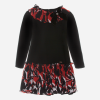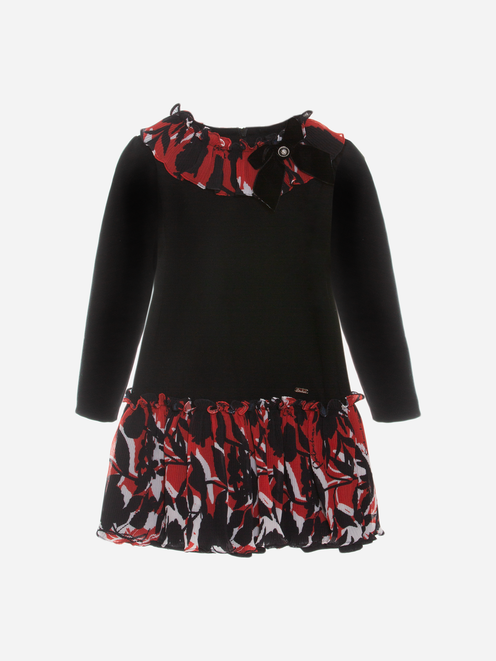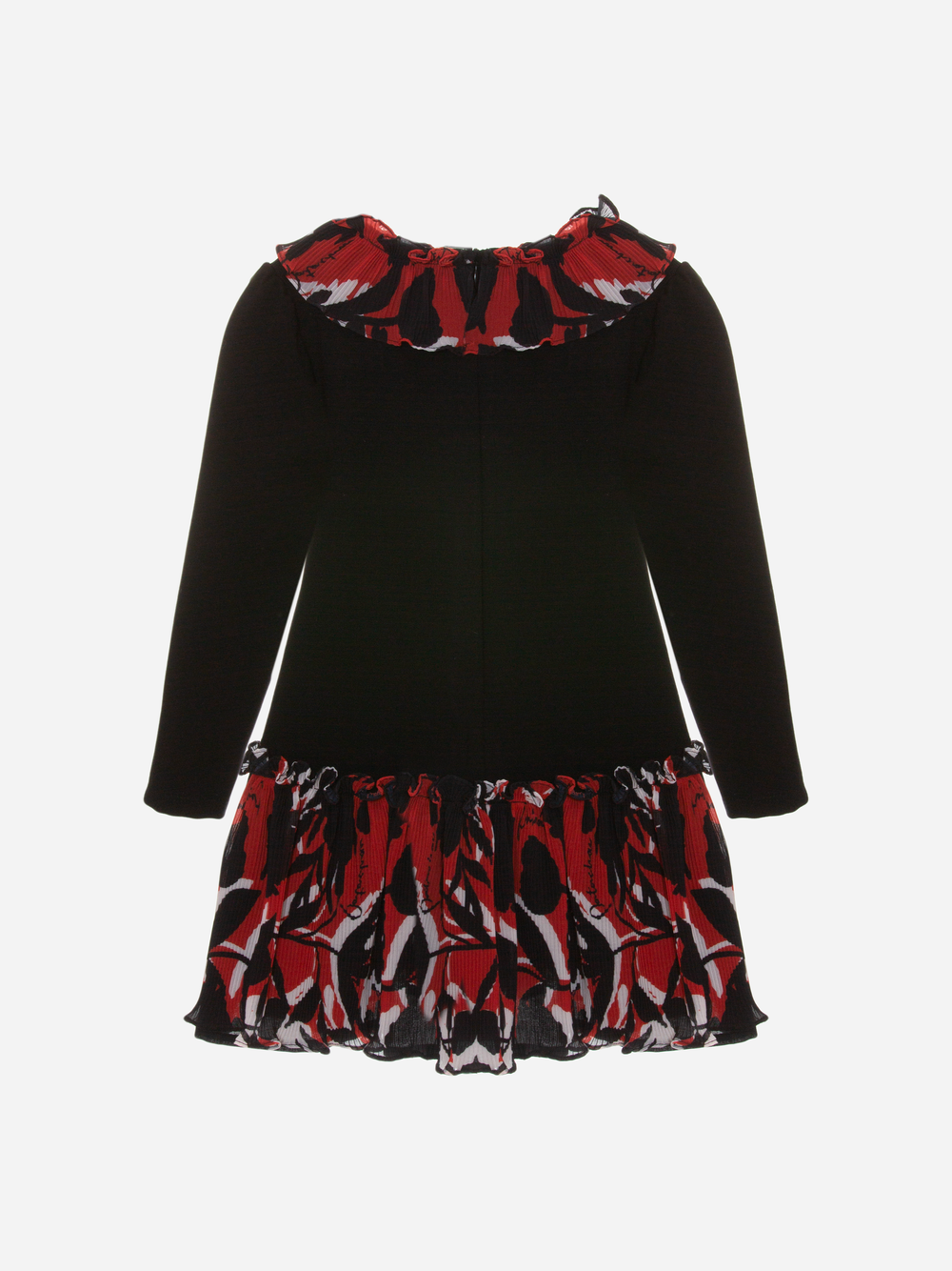 Black dress made in interlock with an collar and skirt panels made in red twist printed chiffon .
