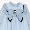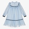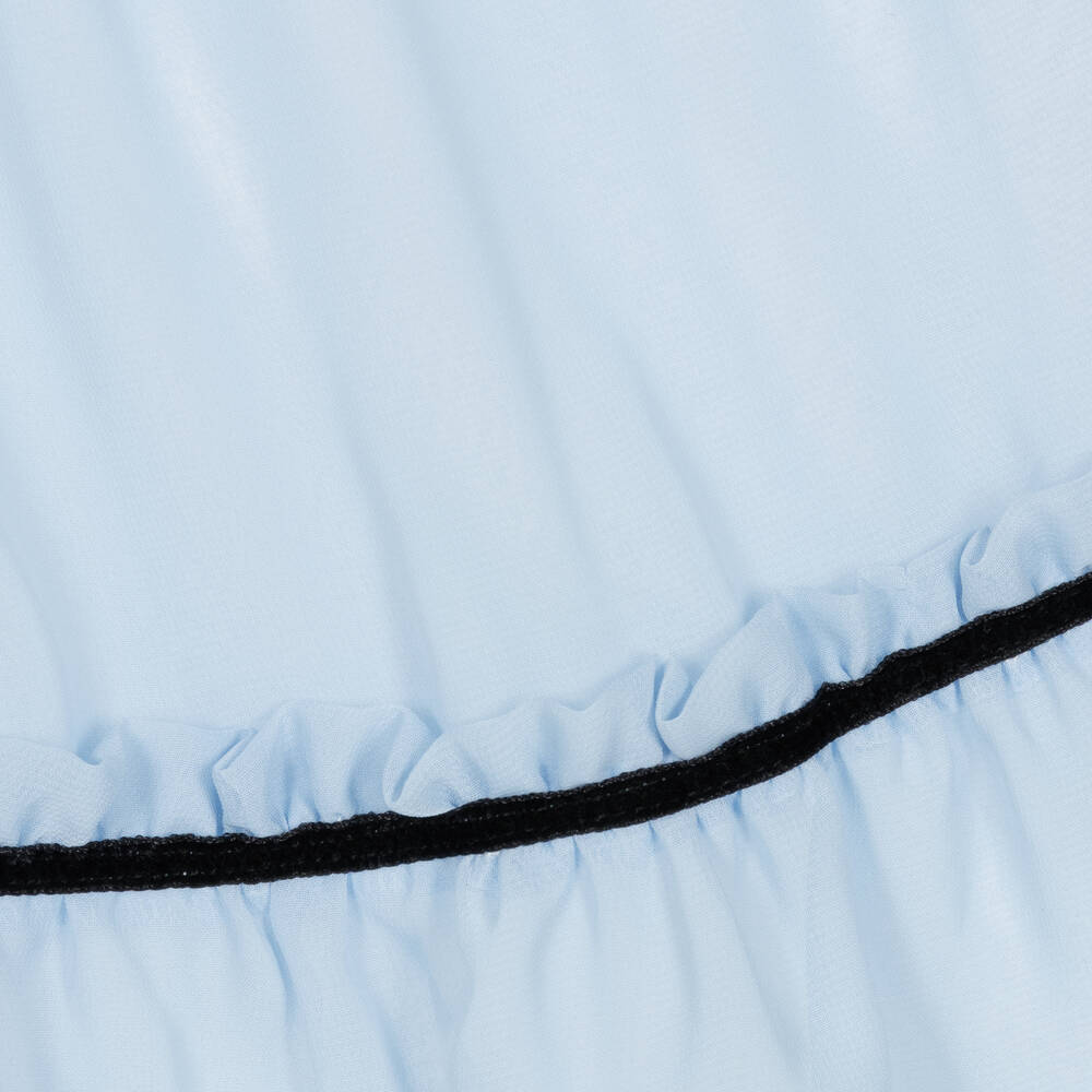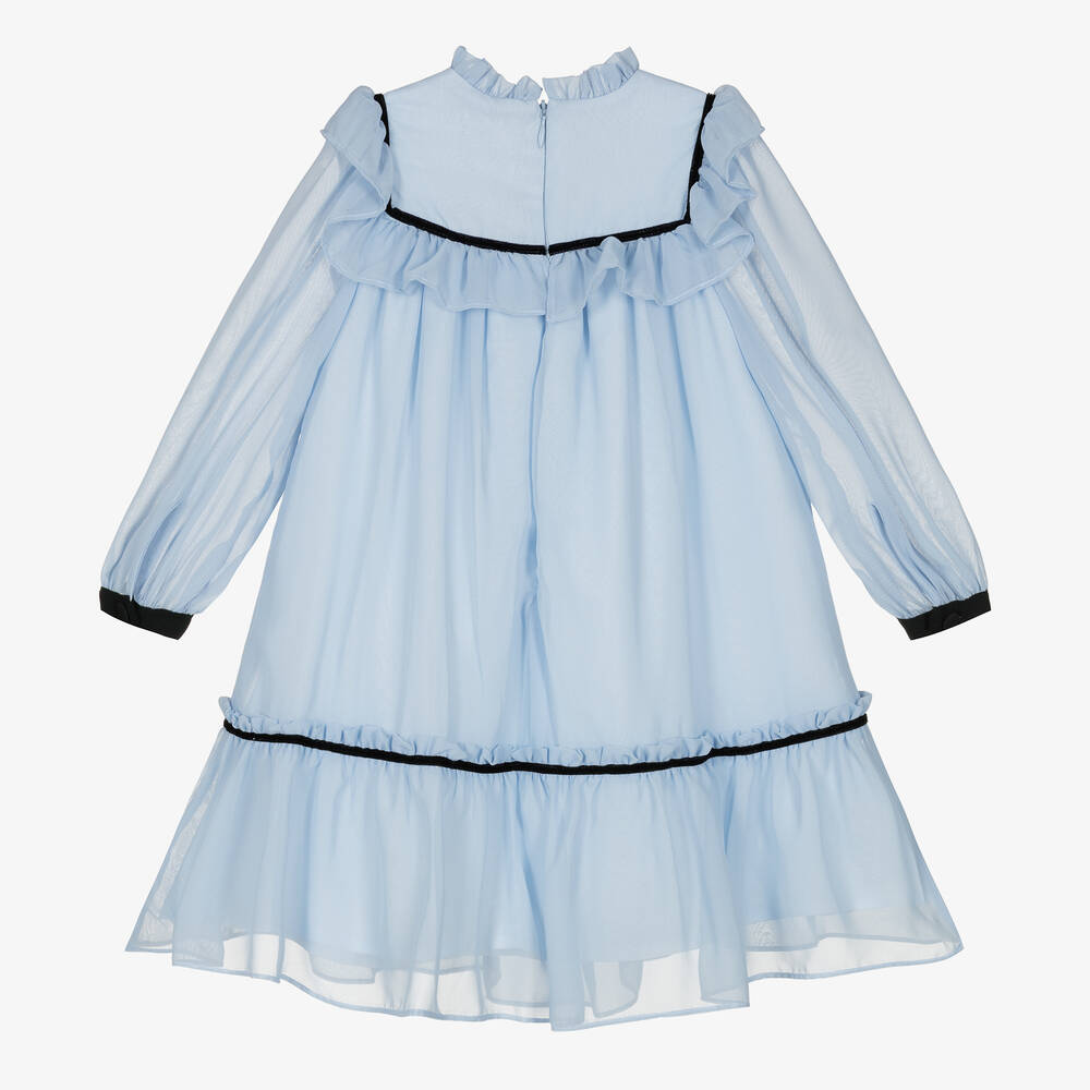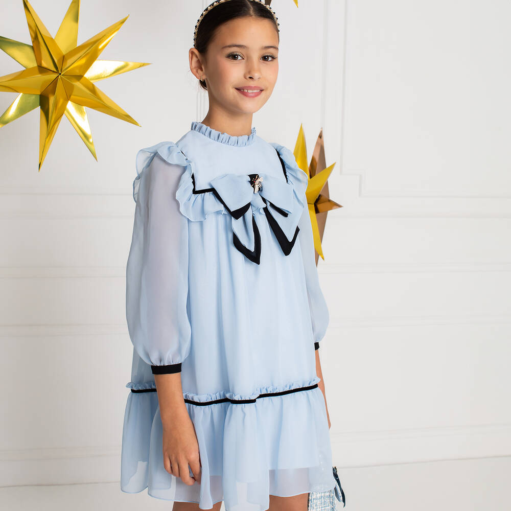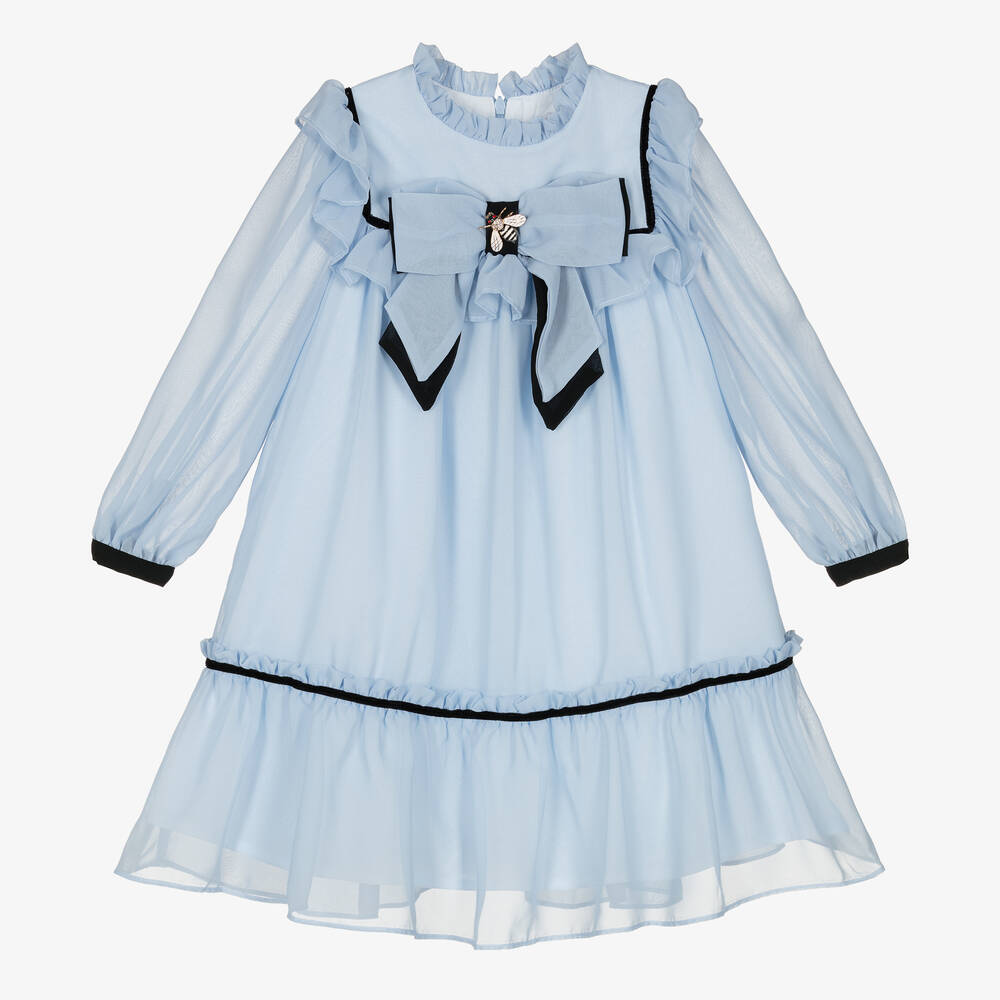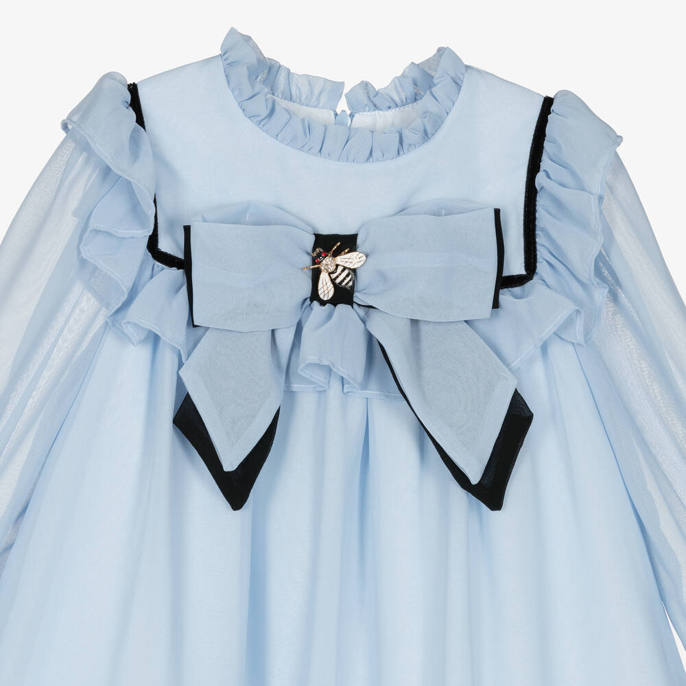 Pale blue chiffon dress for girls by Portuguese brand Patachou. A classic look, the dress has lovely ruffles on the neckline, bodice and hem, with striking contrast black detailing. The front bow is trimmed with an ivory,  black and golden metal bee brooch, with diamantés to sparkle in the light beautifully. The dress has sheer sleeves for a pretty effect, buttons on the cuffs to help with dressing and a double-layer cotton voile lining for comfort. It fastens with a neat hidden zip on the back.