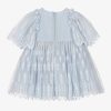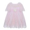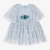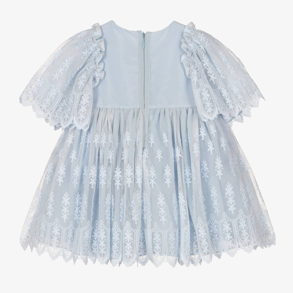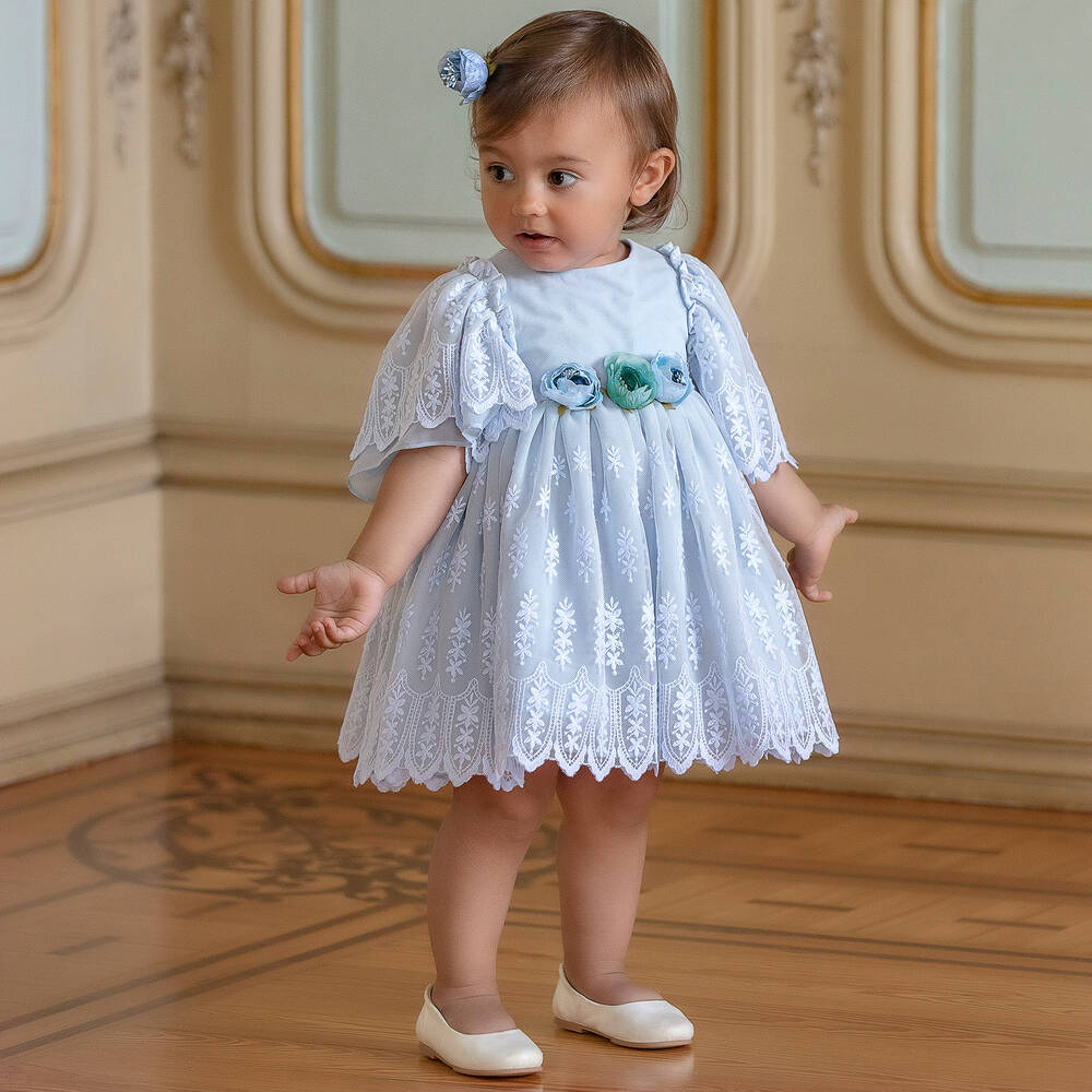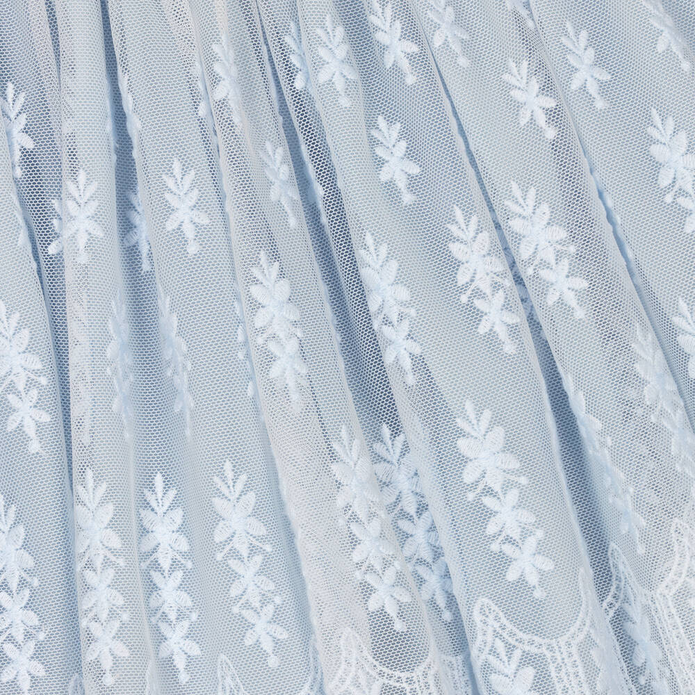 A gorgeous pale blue dress for little girls by Patachou, made in luxurious cotton tulle with a soft voile lining. Classically whimsical, this dress has a delicate floral embroidered pattern,with pretty faux flowers on the bodice. The concealed zip fastening is decorated with grosgrain ribbon trims for a pretty finishing touch.