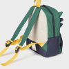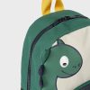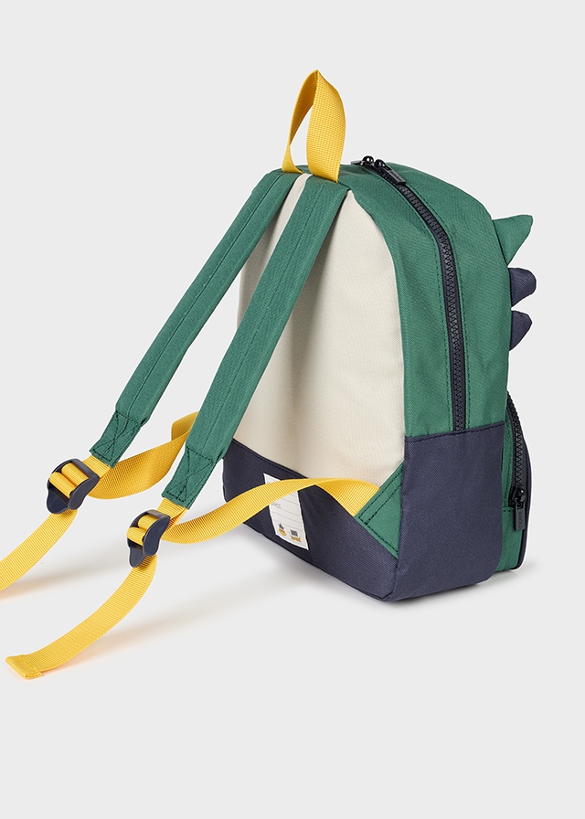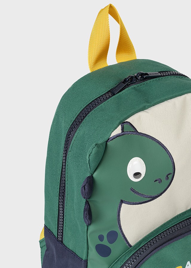 Green backpack for younger boys by Spanish brand Mayoral. Made from soft silky polyester. It features a dinosaur with eye and spike on the front.  It has a main zip compartment and a zip pocket on the front with slogan print. The bag has a adjustable shoulder straps for comfortable use.