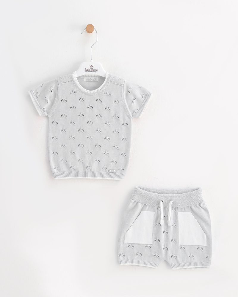 Knitted suit for boys from 100% cotton. The set includes: T-shirt and shorts with an elastic band. Stylish children’s suit is ideal for summer.