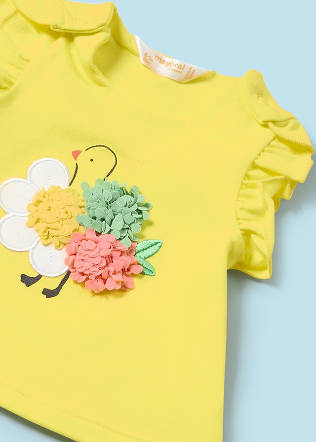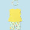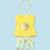 Bright and colourful leggings set for baby girls by Mayoral. Made from soft cotton jersey.The vibrant yellow top has fun 3D textured fruit and a daisy duck design on the front, with frilled short sleeves and popper fastenings on the shoulder.it comes up with patterned with apples, peaches, and lemons, the light green leggings.have elasticated waists for a comfortable fit.Comes with light green headband with fruit printed pattern.