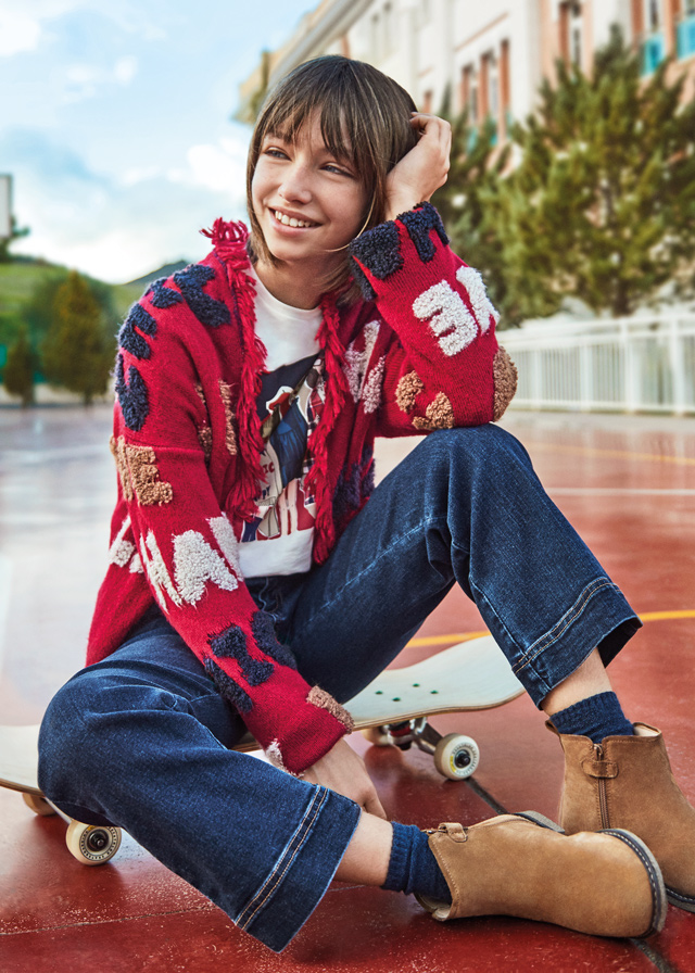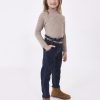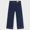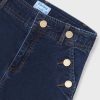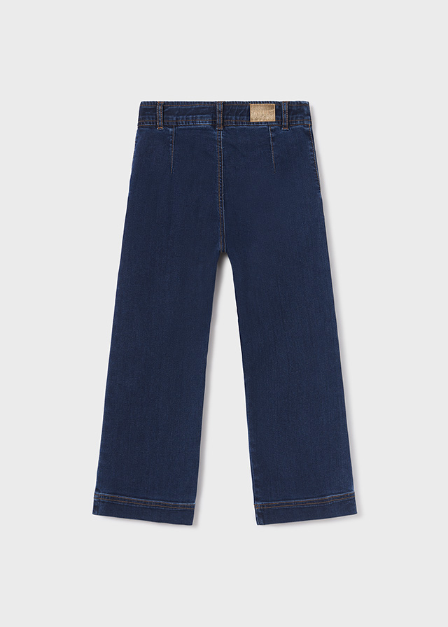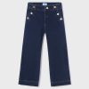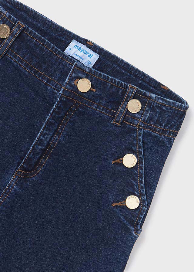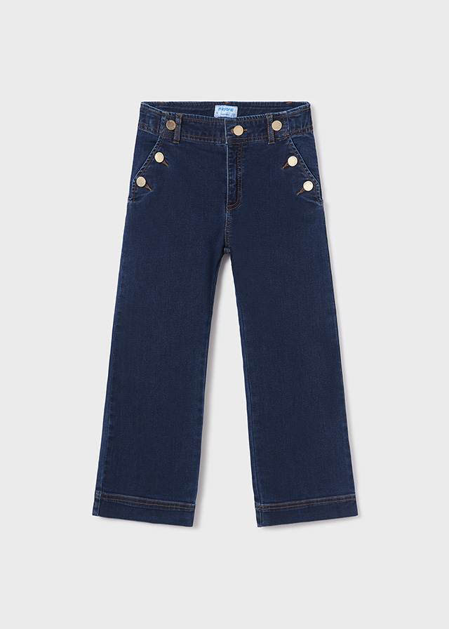 Dark denim trousers for older girls by Mayoral, made from a soft cotton jeans. Lovely for casual styling, they have faux pockets with button detailing to create a pretty sailor-inspired look.They have a wide-leg fit, fastening neatly with a button and zip on the front. An adjustable waist completes the design.