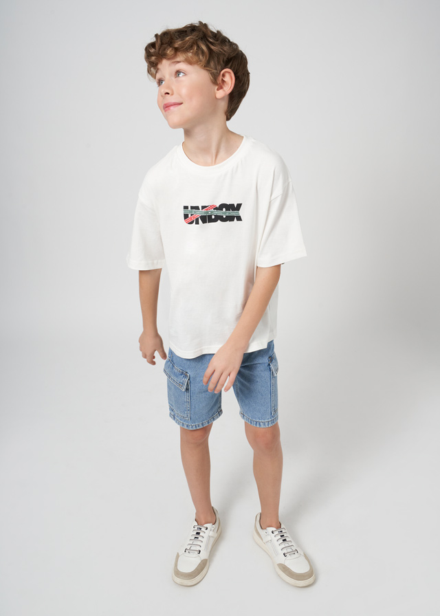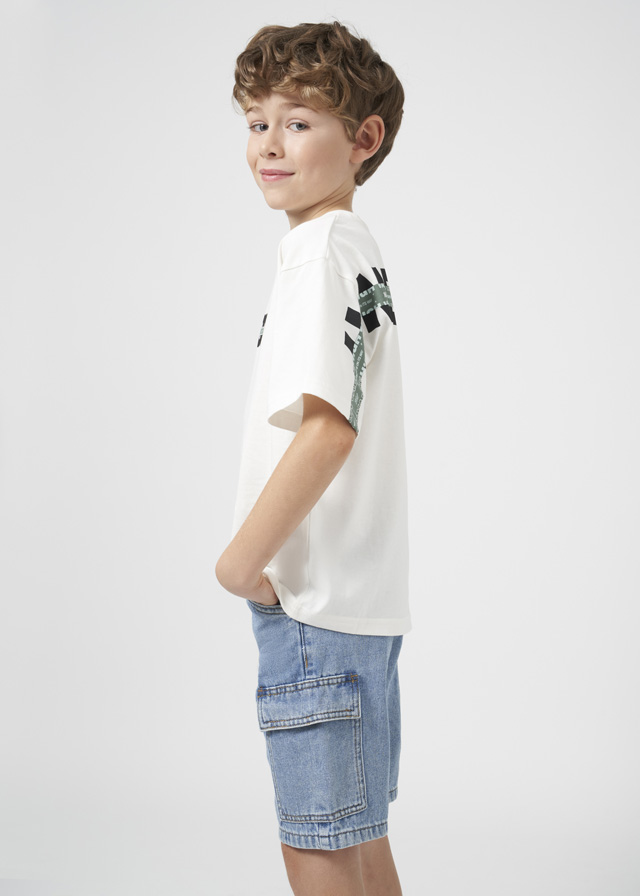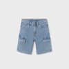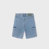 Light blue washed denim shorts for older boys by Mayoral Nukutavake. Comfortable to wear, they have an adjustable waistband to ensure a great fit and fasten with a branded button and zip. Pockets on the front and cargo-style pockets on each leg complete the casual, relaxed look.