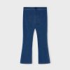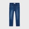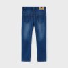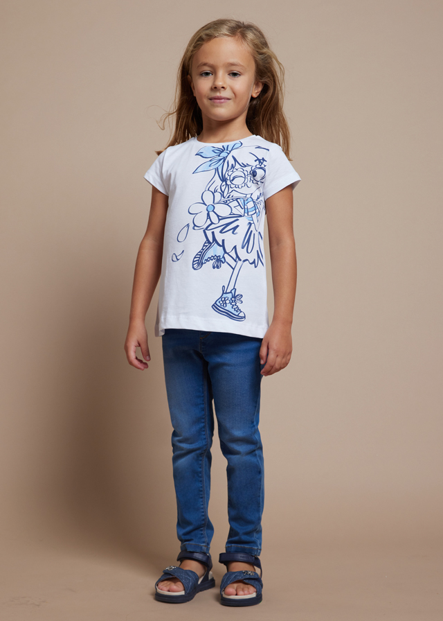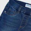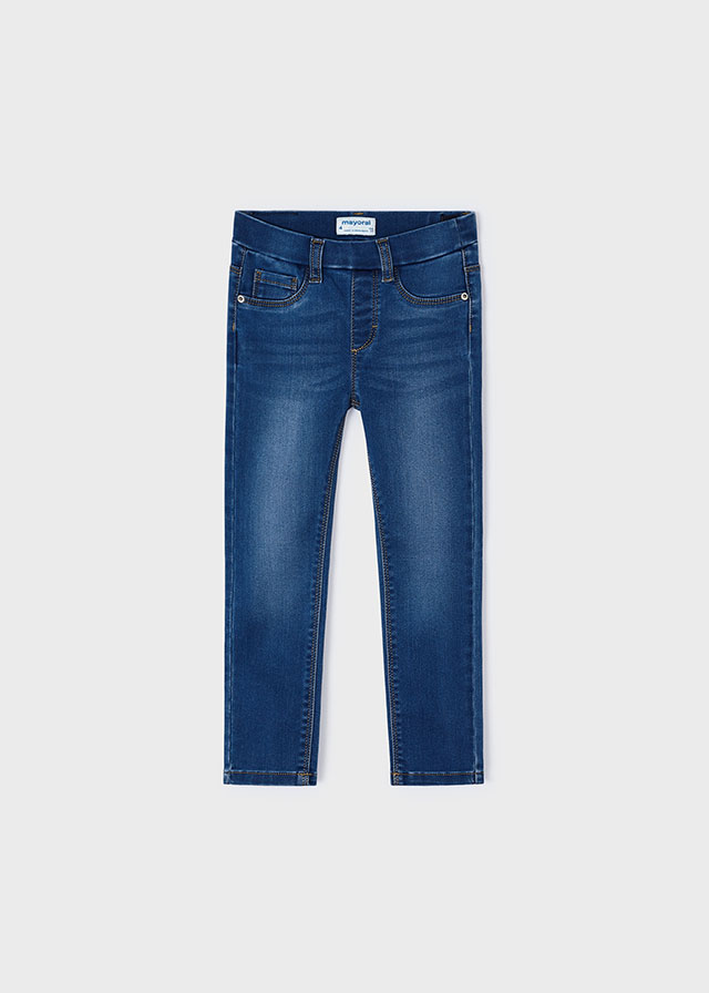 Blue denim-effect jeggings for girls by Mayoral, made from a soft and stretchy cotton blend. Designed for comfortable wear, these skinny-fitting leggings have faux front pockets and an adjustable waistband. A brown logo badge and patch pockets on the back give a casual finish.