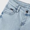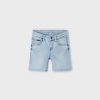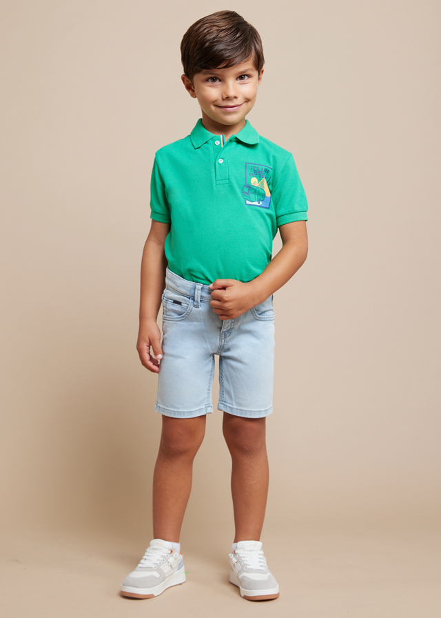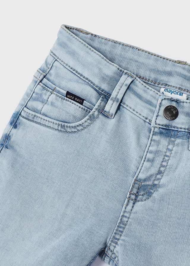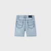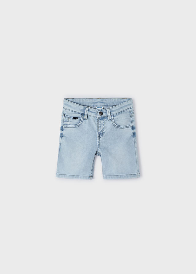 Light-blue denim shorts for boys from Mayoral. With a stonewash effect, these comfortable shorts are made in soft and stretchy cotton-blend jersey, designed to look like denim. They have an adjustable waist for the ideal fit and an easy-to-use front popper disguised as a button.Sizes for older boys also have a zip closure on the front. They are styled with a navy blue logo patch on the back and five practical pockets.