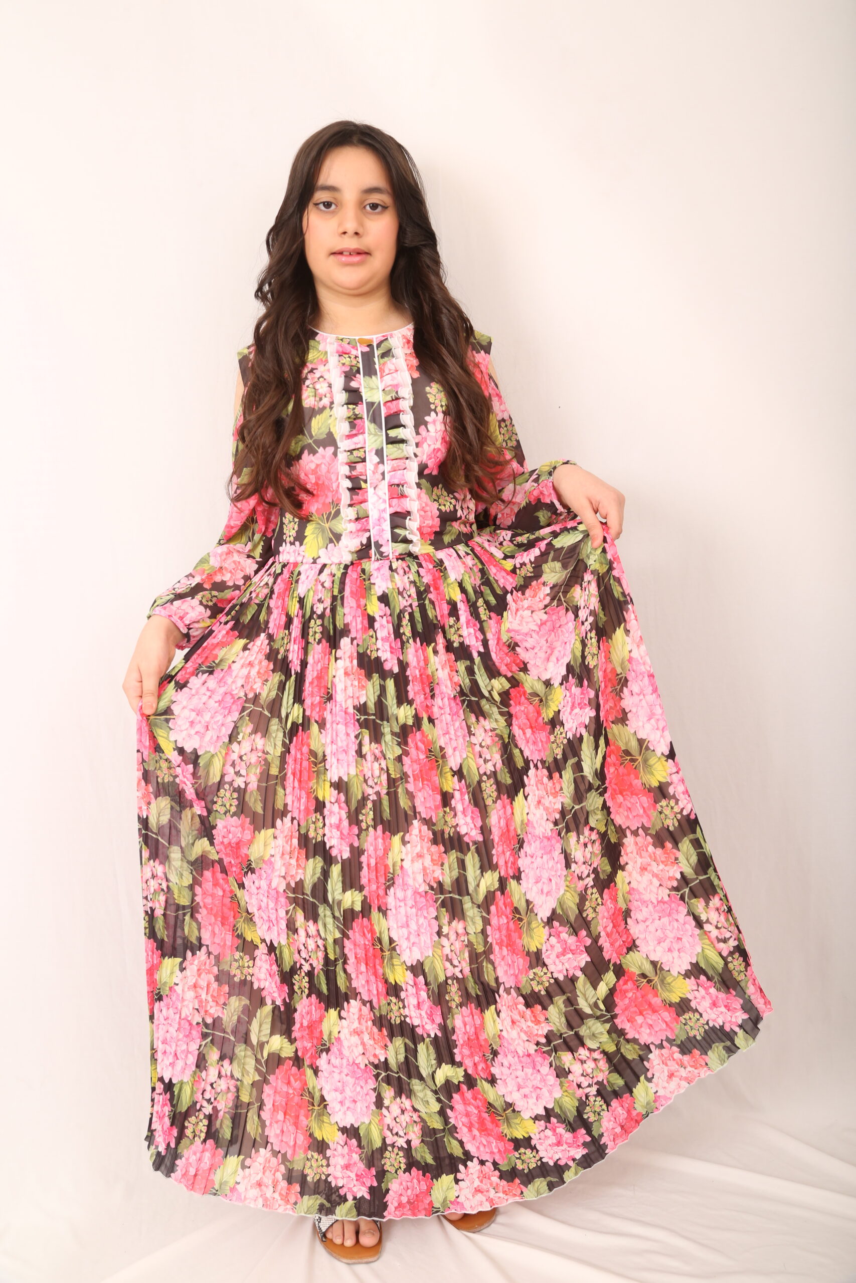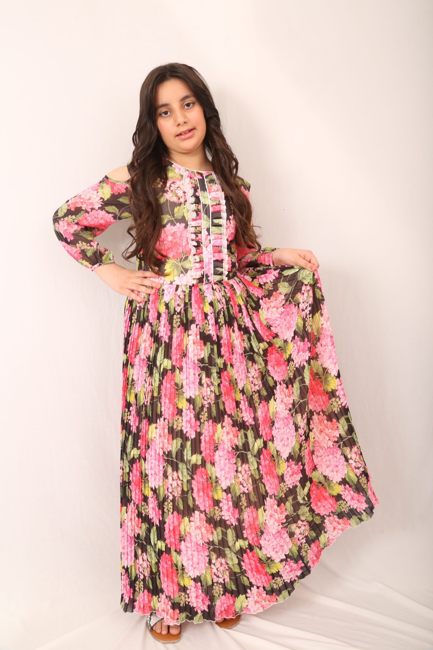 Girls black pleated floral dress from Speranza, made in luxuriously soft chiffon. This dress is design as off shoulder that makes it more fascinating and is fully lined in a lightweight cotton blend.