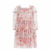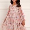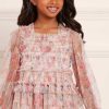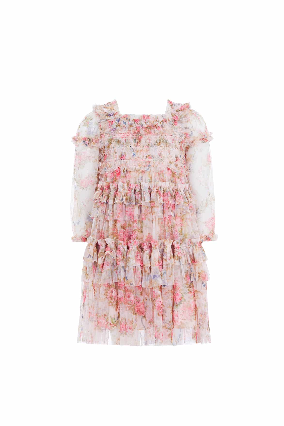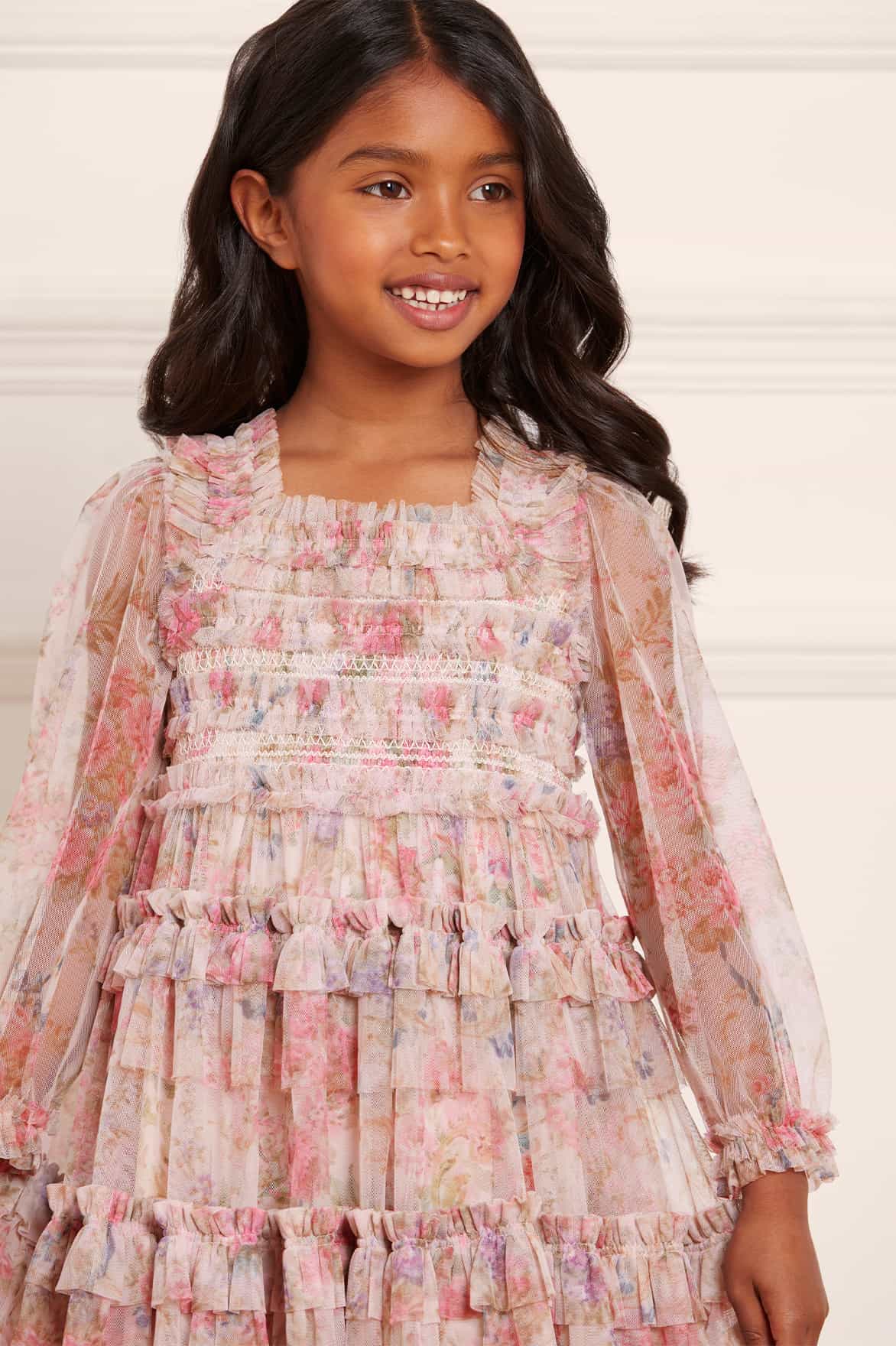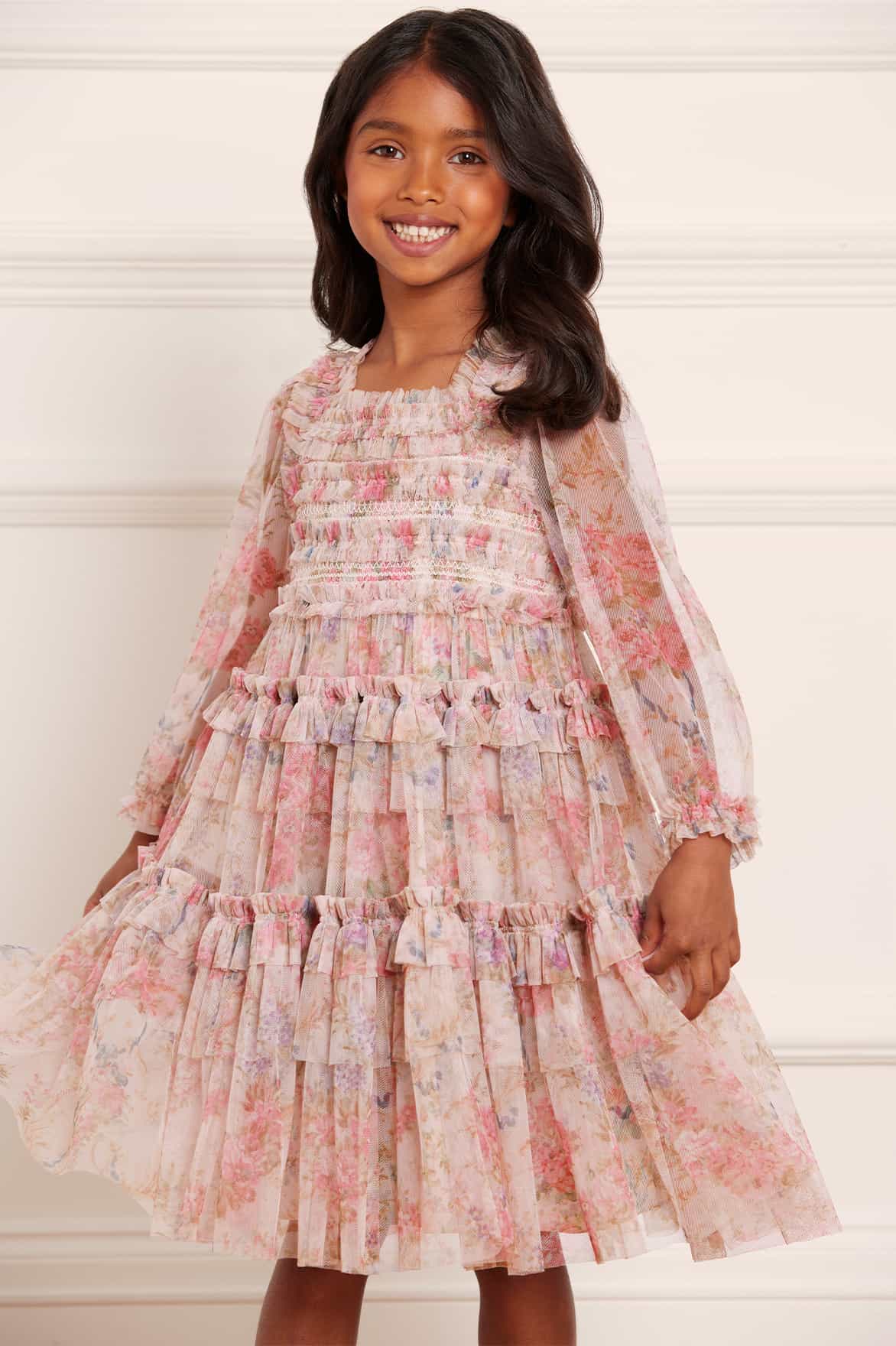 The Floral Wreath Smocked KIDS Dress in Petal Pink. Beautifully designed with a floral wreath artwork, taken from an early 1900’s hand-painted fabric. Made from delicate tulle, this dress features a smocked bodice for stretch and comfort. Adorned with frill and ruffle trims for signature Needle & Thread detailing. The perfect dress for your little one’s next holiday or upcoming occasion.