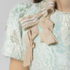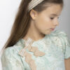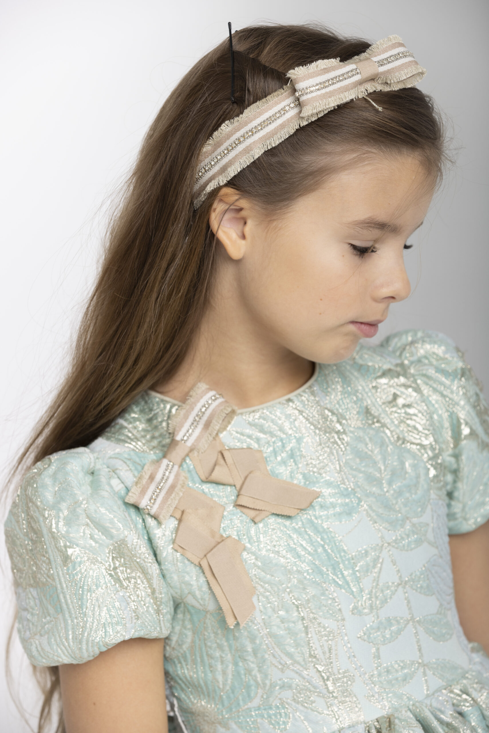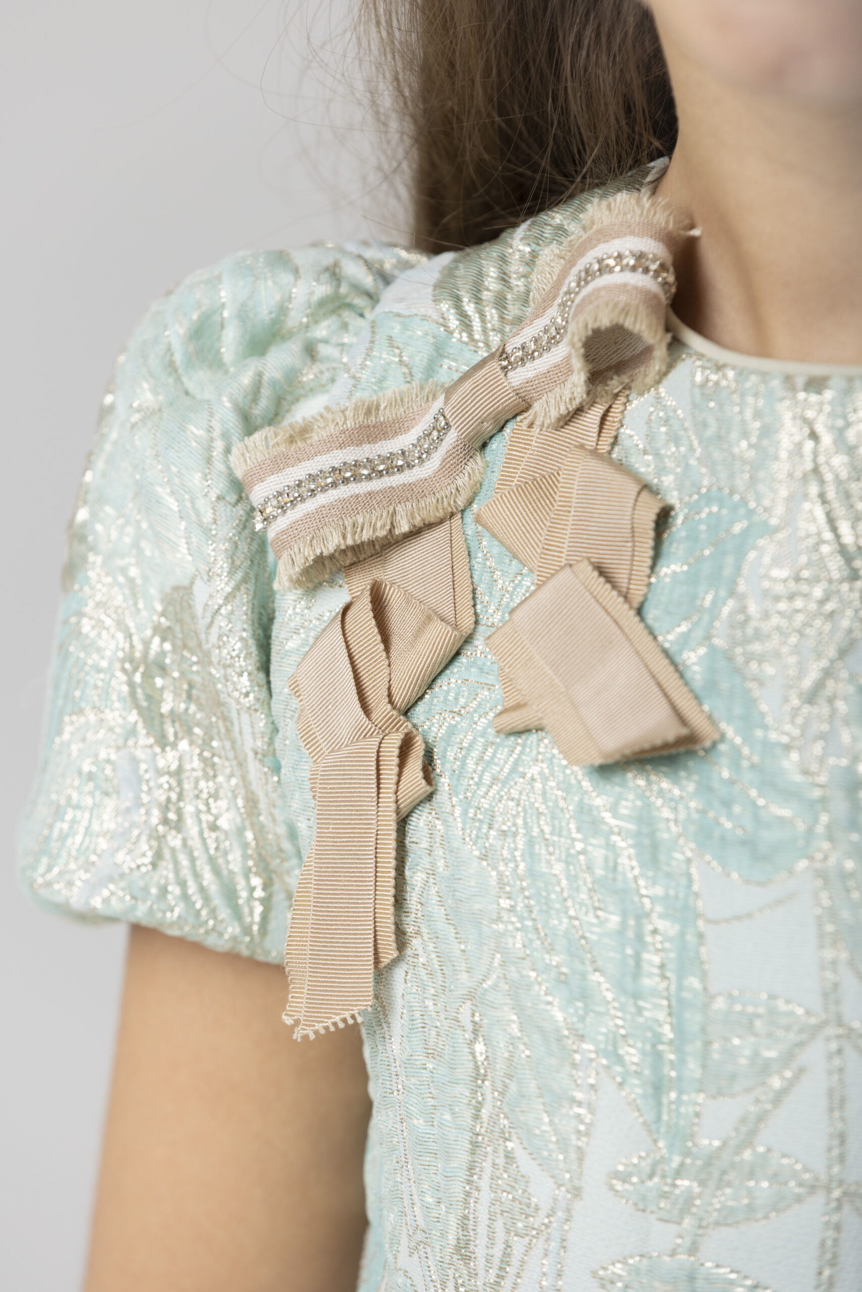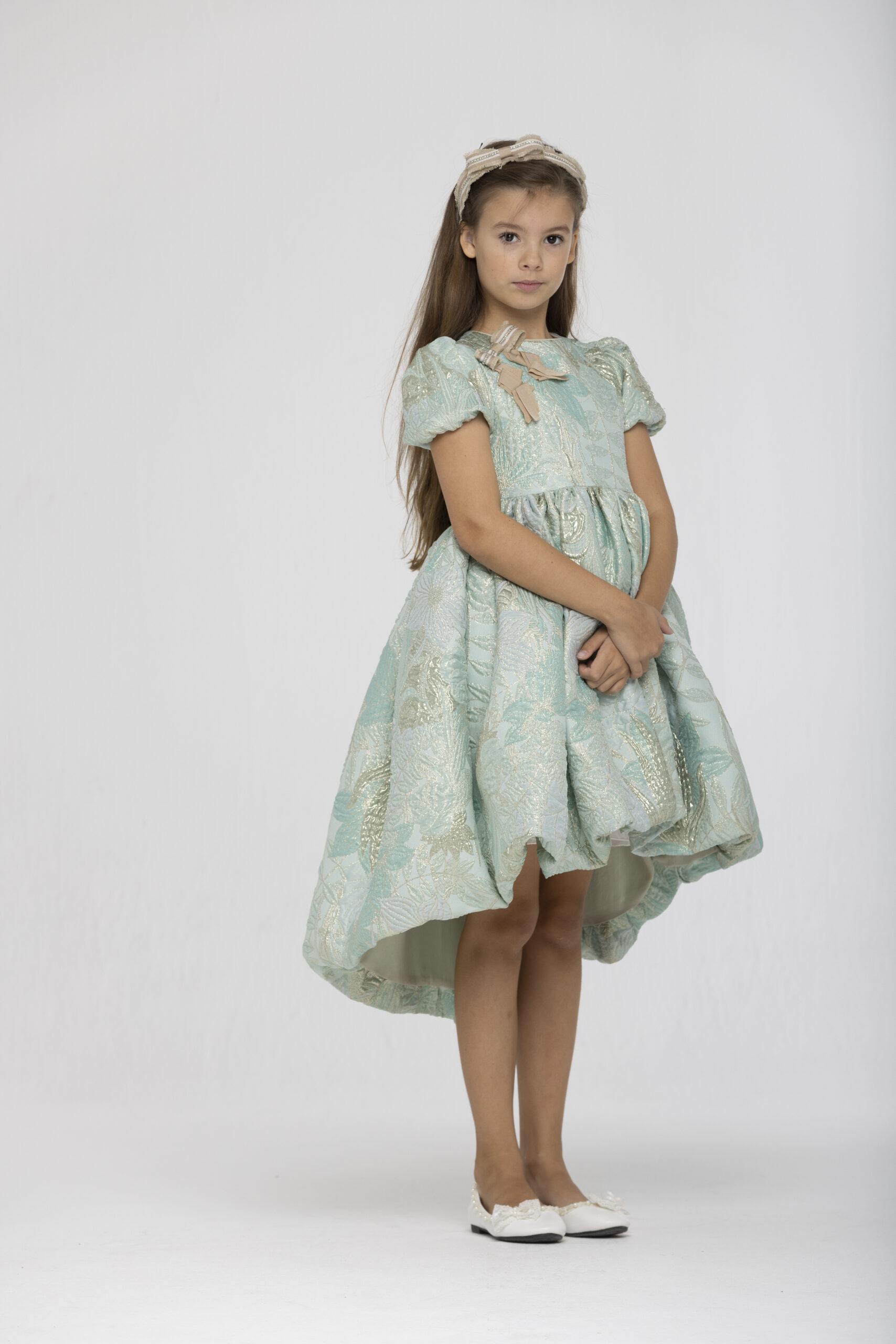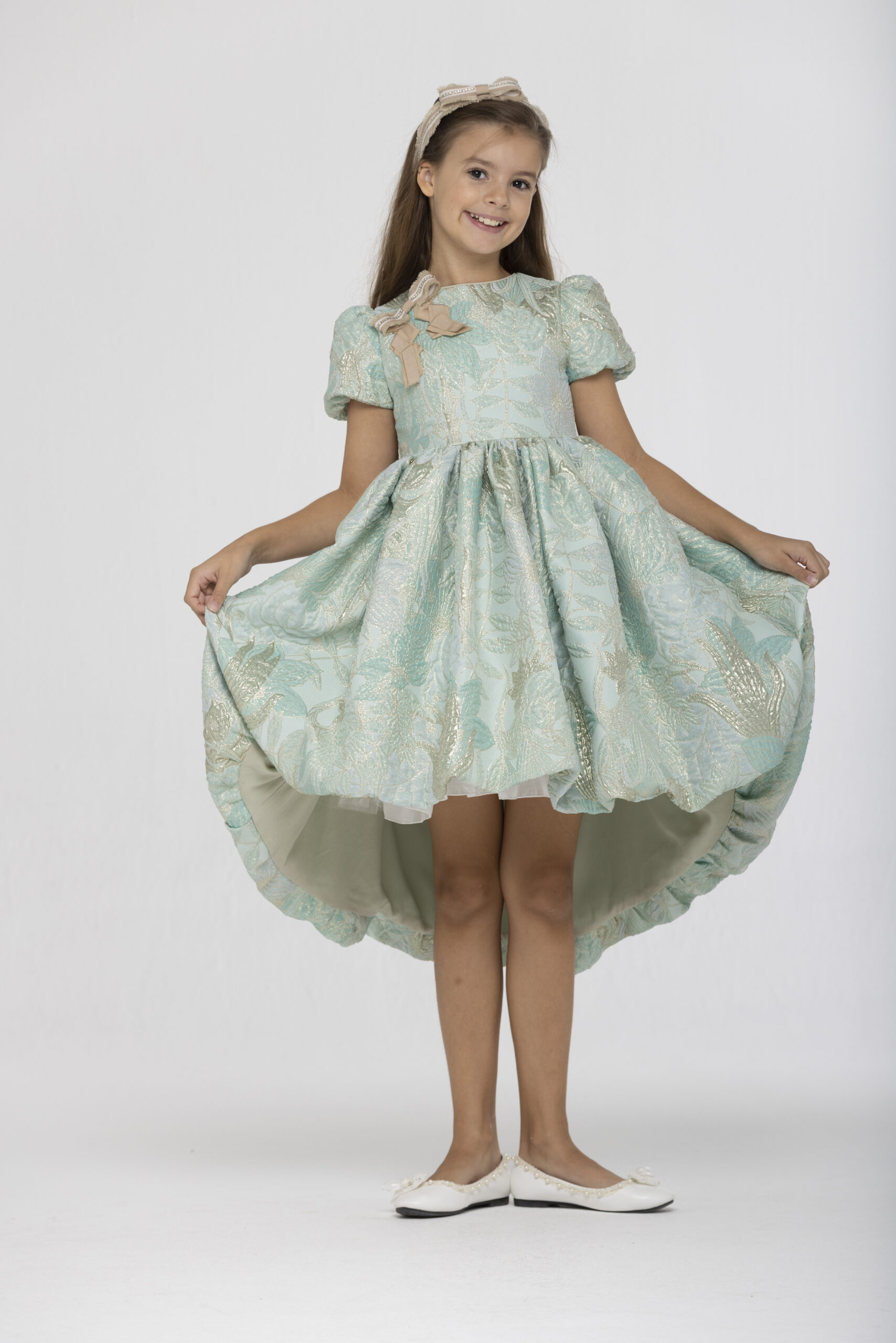 Lovely Speranza green gold brocare dress with a big ribbon on the shoulder.