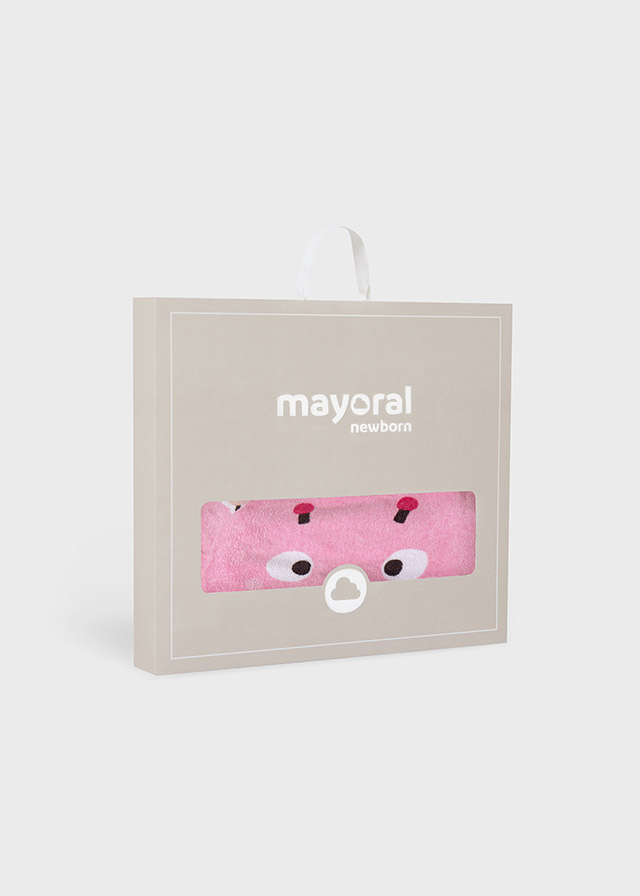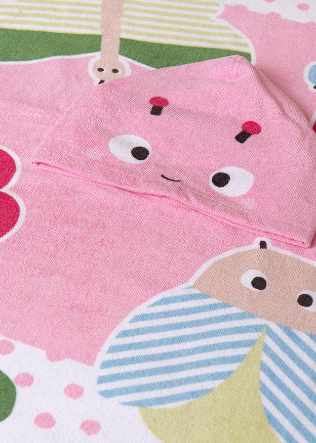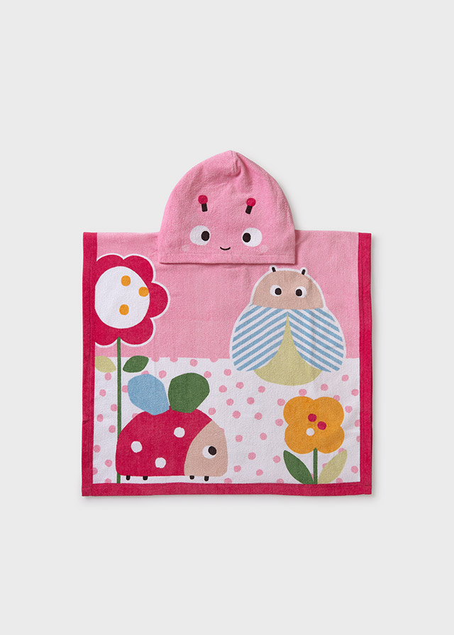 Pink hooded poncho towel for girls by Mayoral, made in soft and absorbent cotton towelling. Lovely for keeping dry at the beach, pool or resort, this playful cover-up has cute and colourful ladybird, flower and polka dot print for a holiday-inspired look.