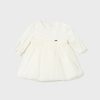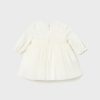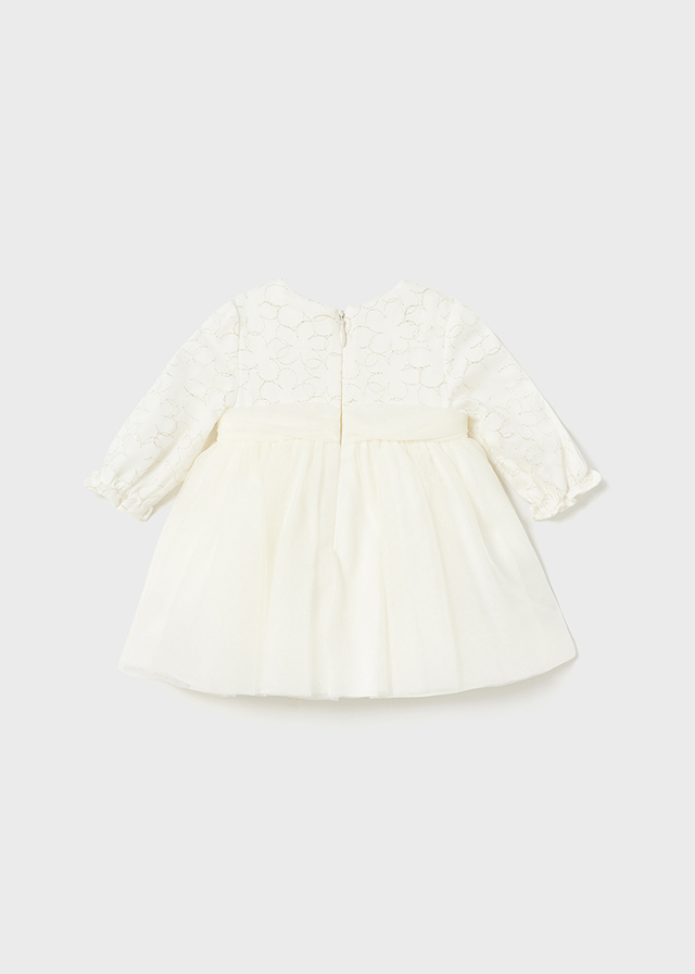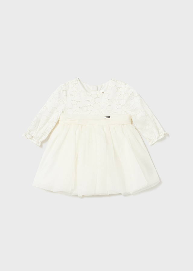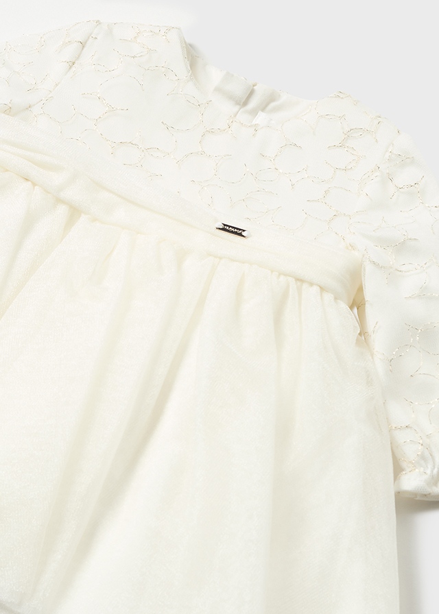 Ivory special occasion dress for baby girls by Mayoral, made from delicate tulle with a soft cotton underskirt. The bodice is embroidered with beautiful gold flowers for a touch of sparkle and the cuffs are gently elasticated for added comfort. The fixed sash on the waist is decorated with a silver logo charm and the zip fastening is neatly concealed on the back.