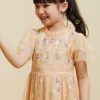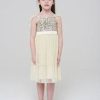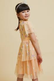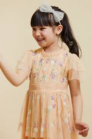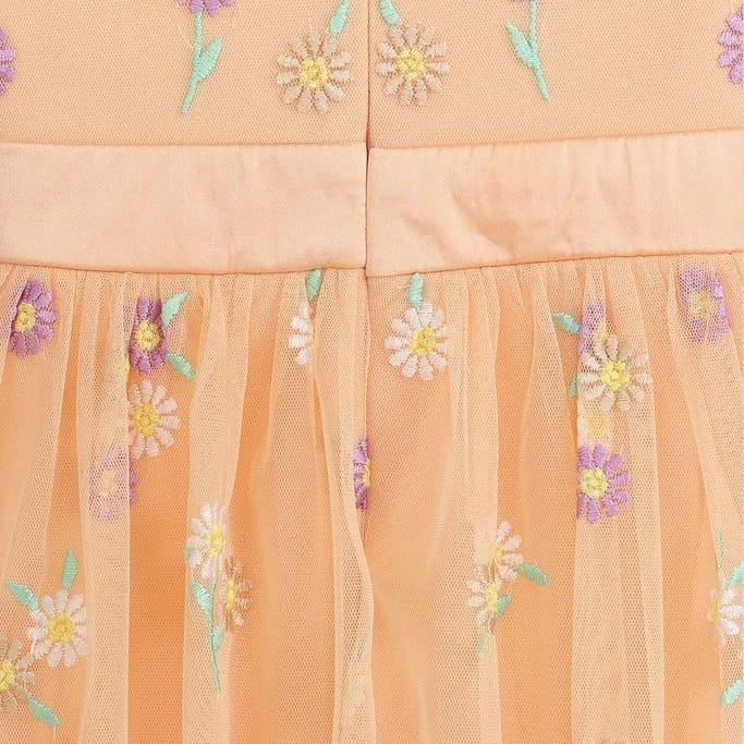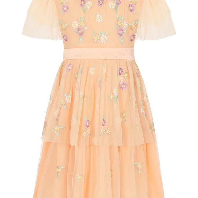 Realised in a sweet almond hue, the darling Josie dress is strewn with pretty daisy embroidery. Perfect for parties and weddings, Josie is complete with a tiered mesh skirt, flared sleeves and a satin belt.