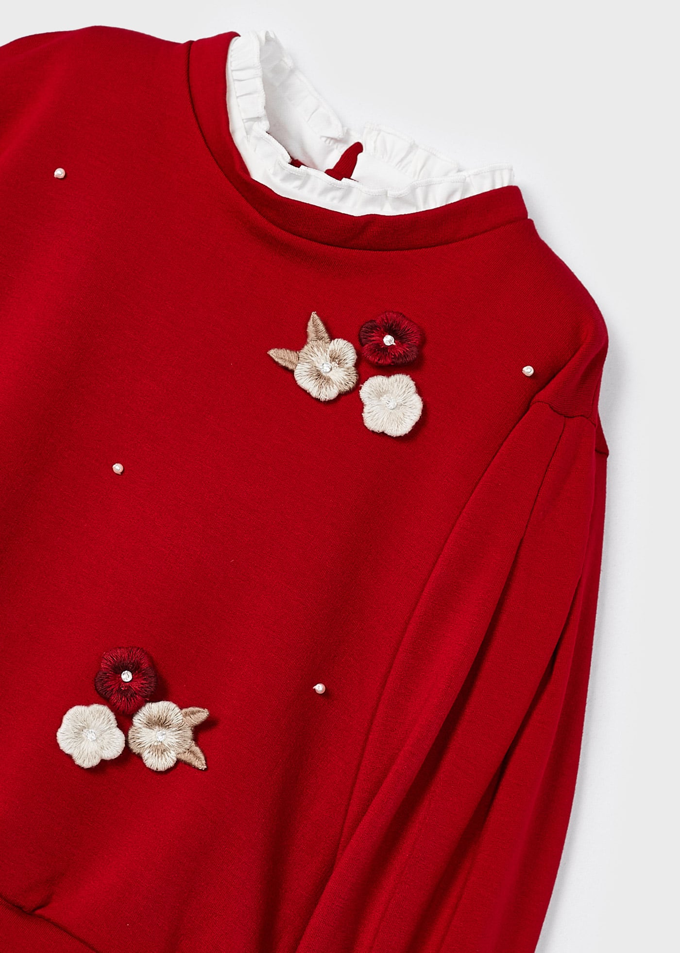 A grey, beige and ivory trouser set for younger girls by Mayoral, made in a soft and cosy viscose-blend knit. The sweet top has a ruffle hem and a little beige puppy dog design on the front, with ‘Amour’ embroidered in black. It fastens with shimmering beige buttons on the back. Completing the set are trousers with an elasticated waist for simple, fuss-free dressing and changing.