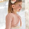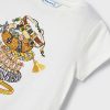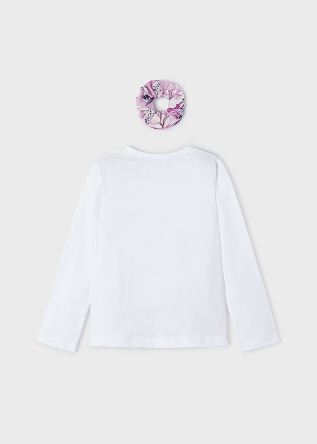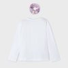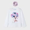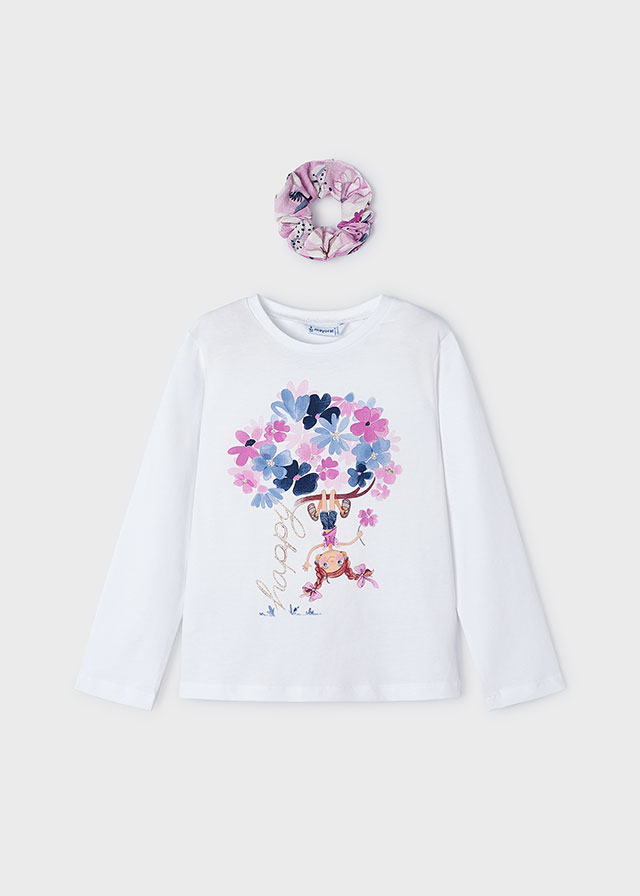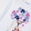 White long-sleeved top for girls by Mayoral, made in soft and comfortable cotton jersey. It has a fun girl print on the front, incorporating pretty pink and blue flowers, and the word ‘Happy’ in sparkling gold letters.
