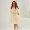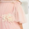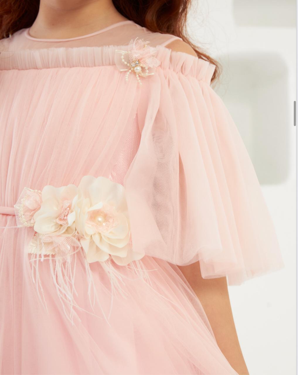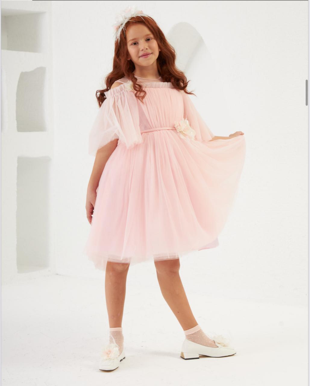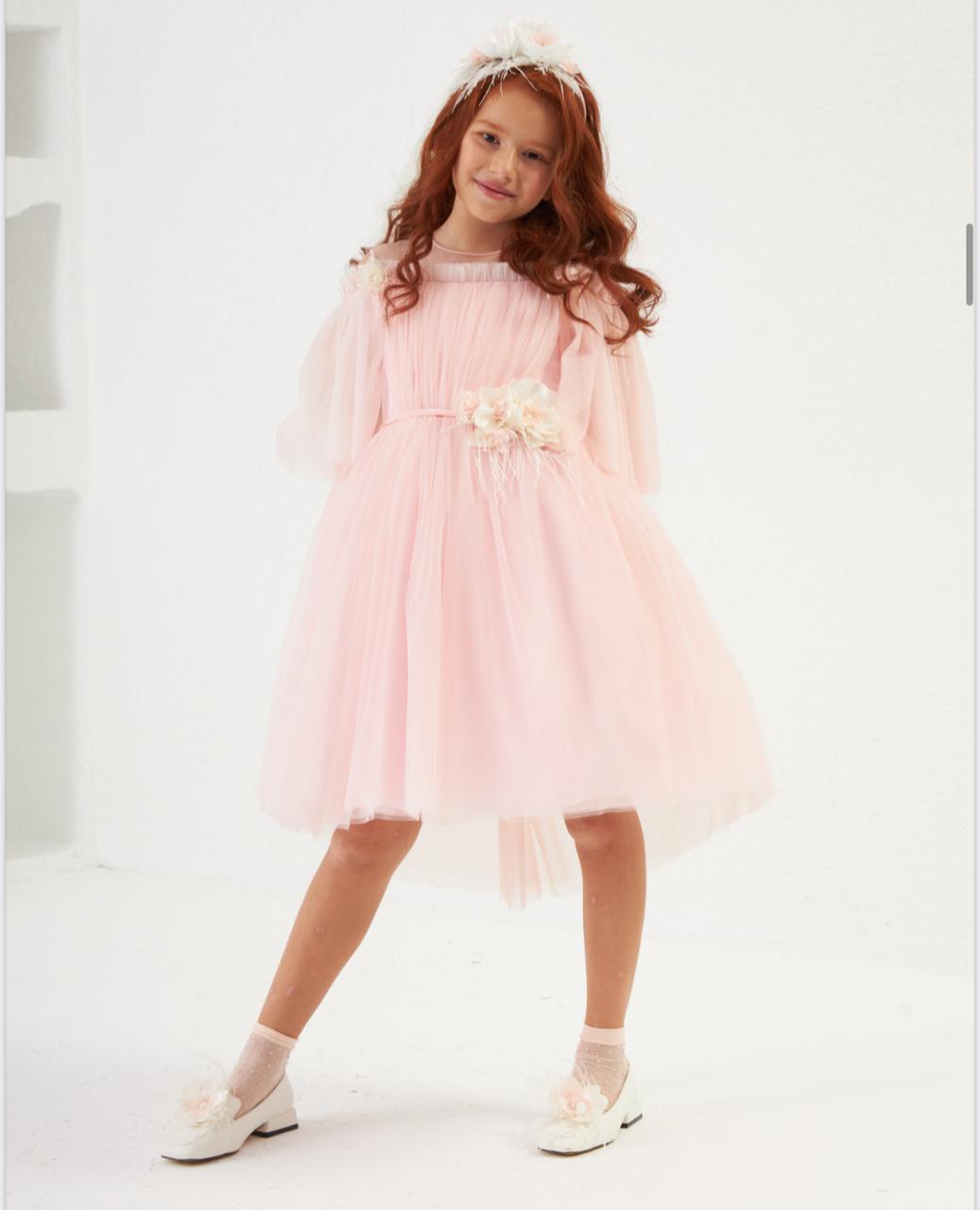 Girls in pretty pink dress made in soft, lightweight organza. Lovely for a special occasion, the dress has delicate mesh around the neckline and flutter shaped short sleeves, a big bow at the back for a gorgeous feminine look.Fully lined in lightweight cotton for comfort, there is a net underskirt for added volume and a silver back zip fastening.