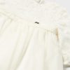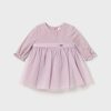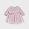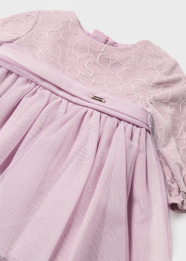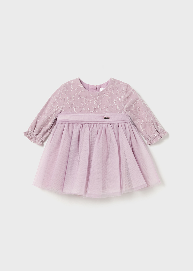 Lilac purple special occasion dress for baby girls by Mayoral, made from delicate tulle with a soft cotton underskirt. The bodice is embroidered with beautiful silver flowers for a touch of sparkle and the cuffs are gently elasticated for added comfort. The fixed sash on the waist is decorated with a silver logo charm and the zip fastening is neatly concealed on the back.