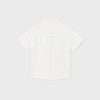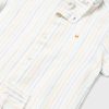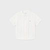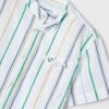 Soft and lightweight for warmer days, a collarless Mayoral shirt for little boys with fine multicolour stripes. Made in a comfortable cotton and linen blend, this short-sleeved style has a discreet, tonal monogram logo on the chest and branded button fastenings.