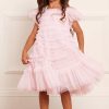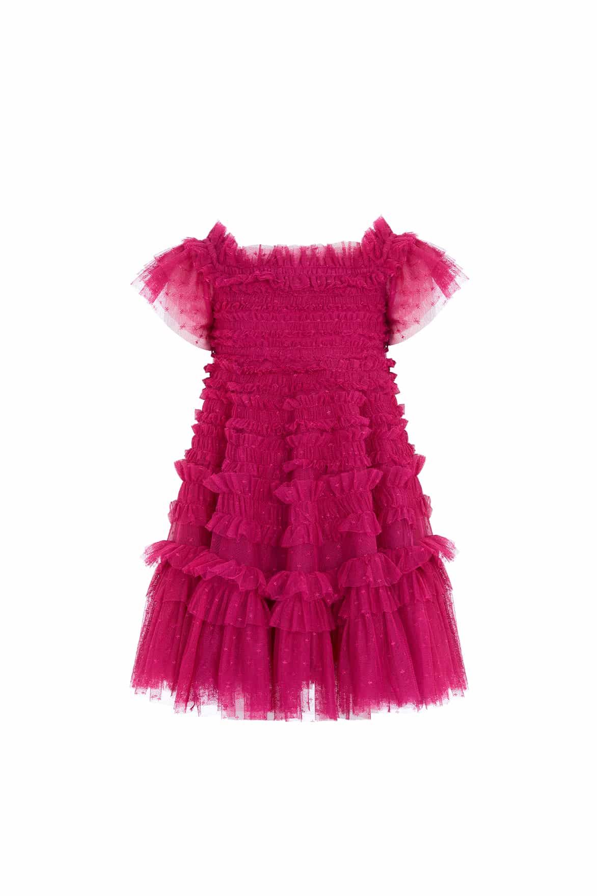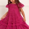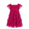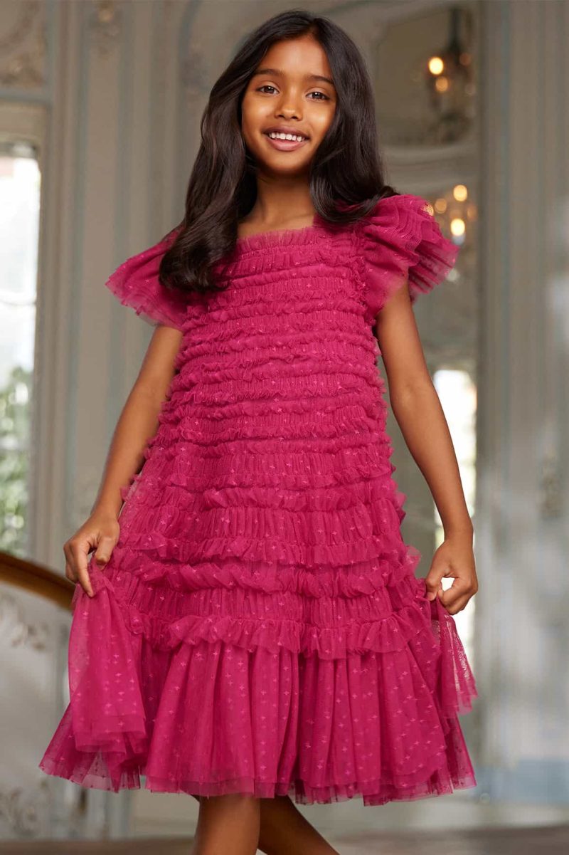This dress is beautifully designed with a signature Needle & Thread textile. Crafted with a playful, frothy texture created using soft tulle panels gathered to create an all over pretty effect. Designed with short sleeves and underlayers of tulle to create a generous volume skirt. The perfect dress for your little one’s upcoming occasions.