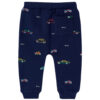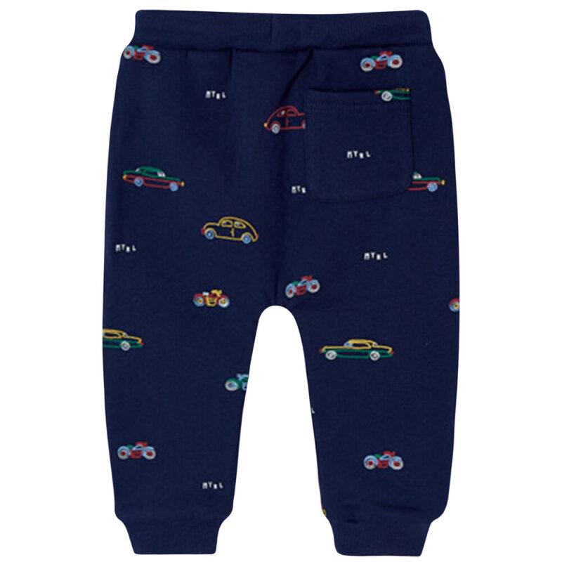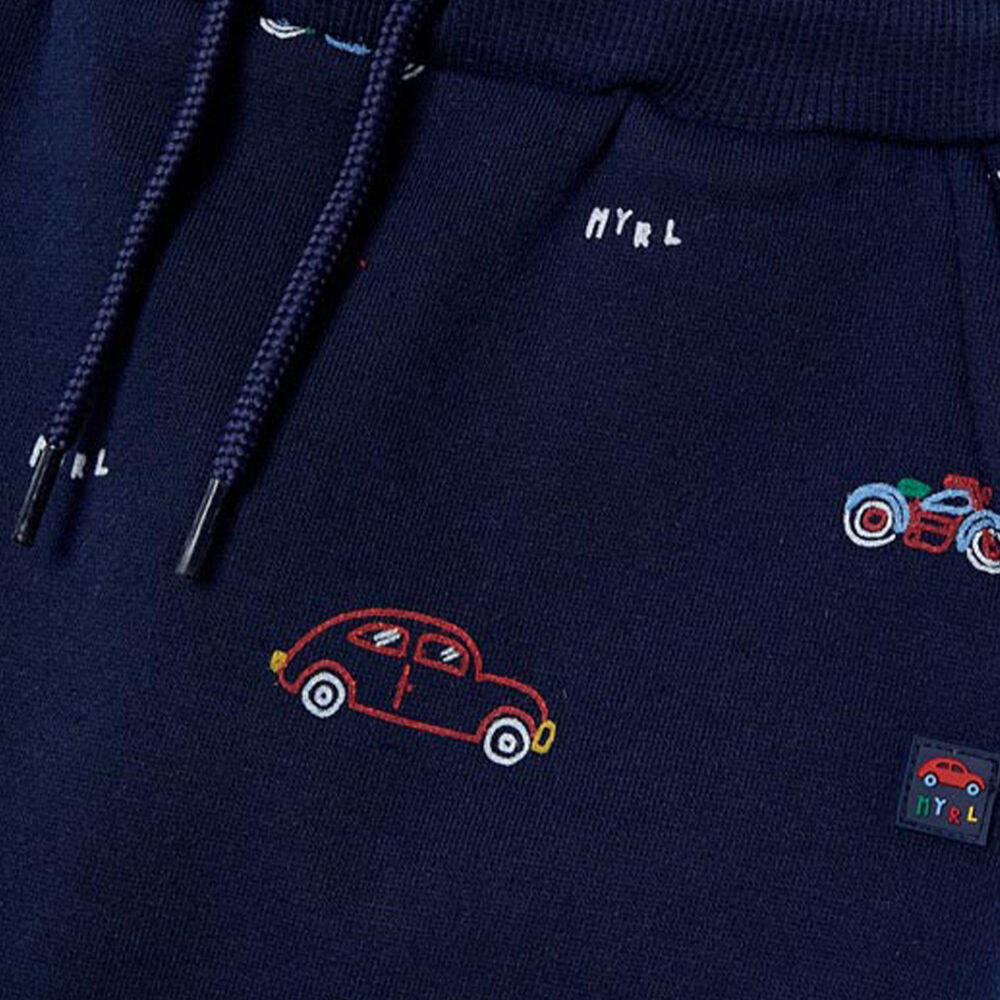 Navy blue joggers for little boys by Mayoral, made in mid-weight cotton jersey. They have a comfortable drawstring waistband and a colourful all-over vehicle print with white logo details. Ideal for playful children,  they have extra durable knees and there is a small pocket on the back for a cute little touch.