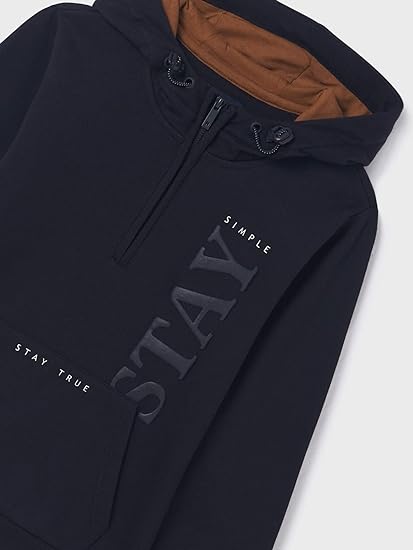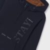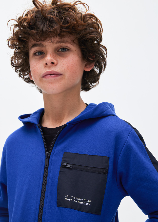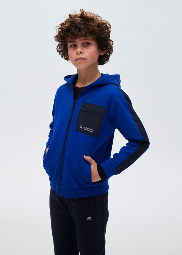 Knitted suit Nukutavake for a teenage boy. Knitwear with thin fleece on the reverse side. Trousers with a cuff and a knitted belt with a drawstring. Hoodie with kangaroo pocket and short zip. The hood is lined in gray jersey, with a decorative elastic cord with stoppers. The sweatshirt and trousers are decorated with rubberized embossing.