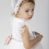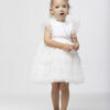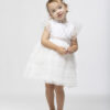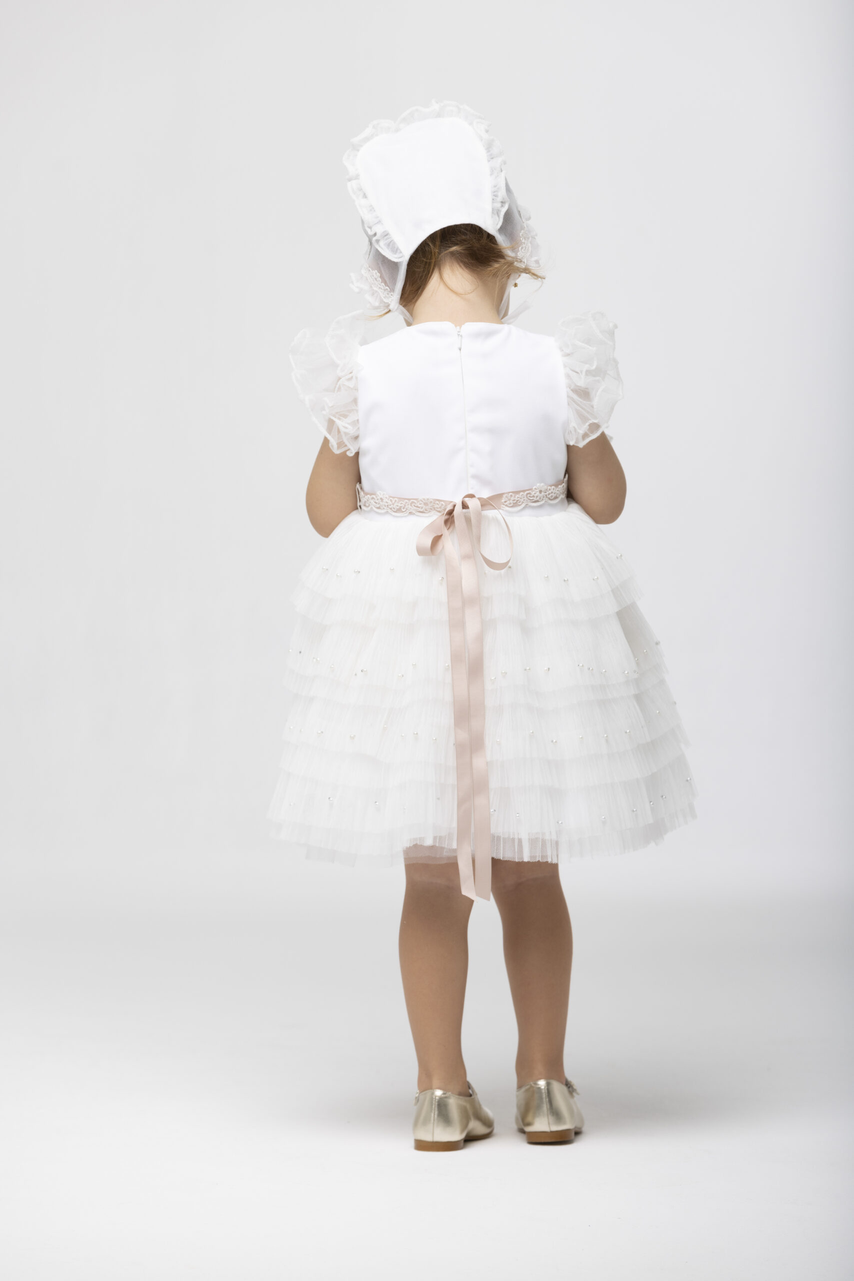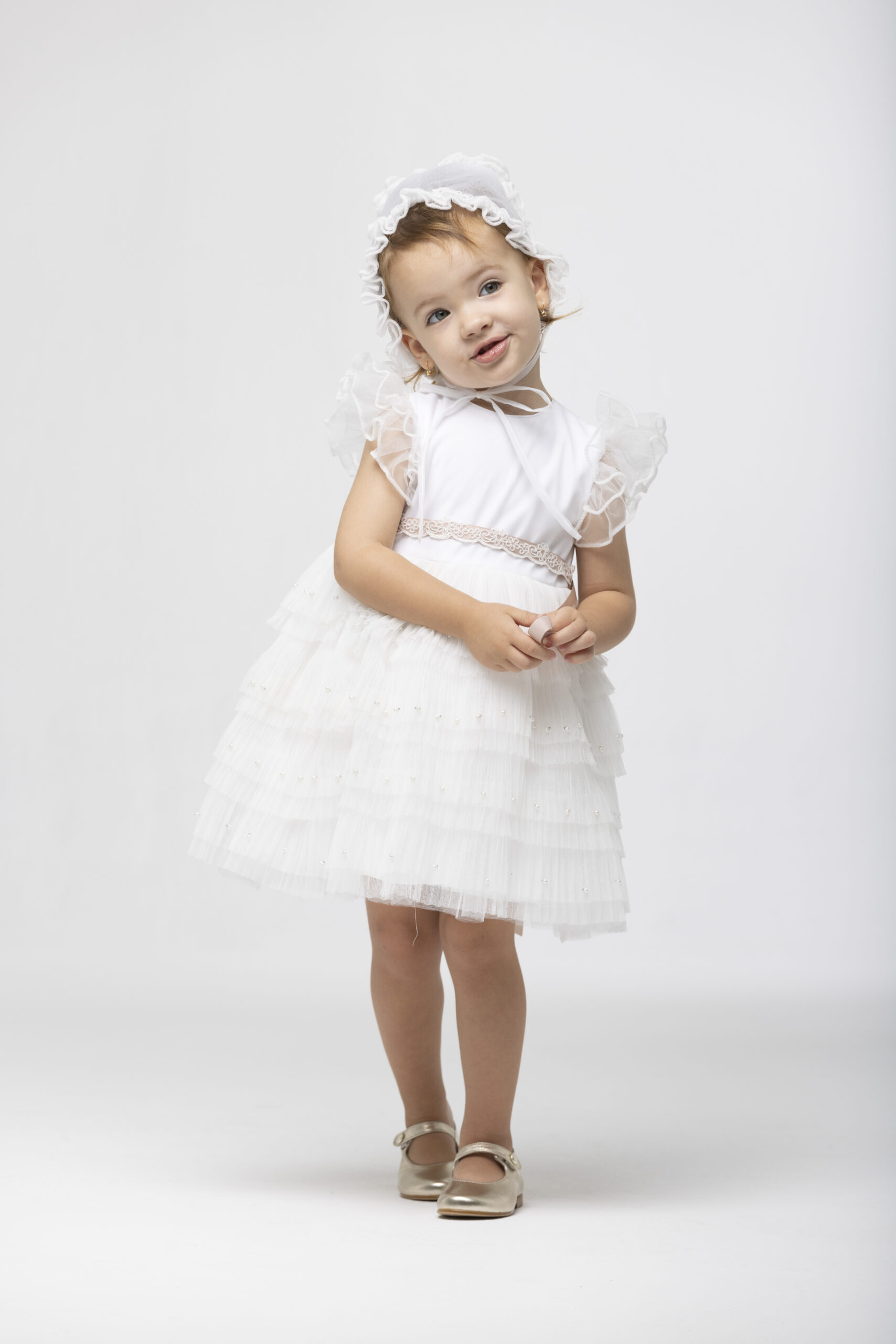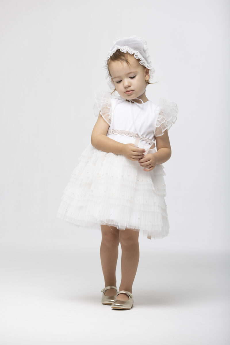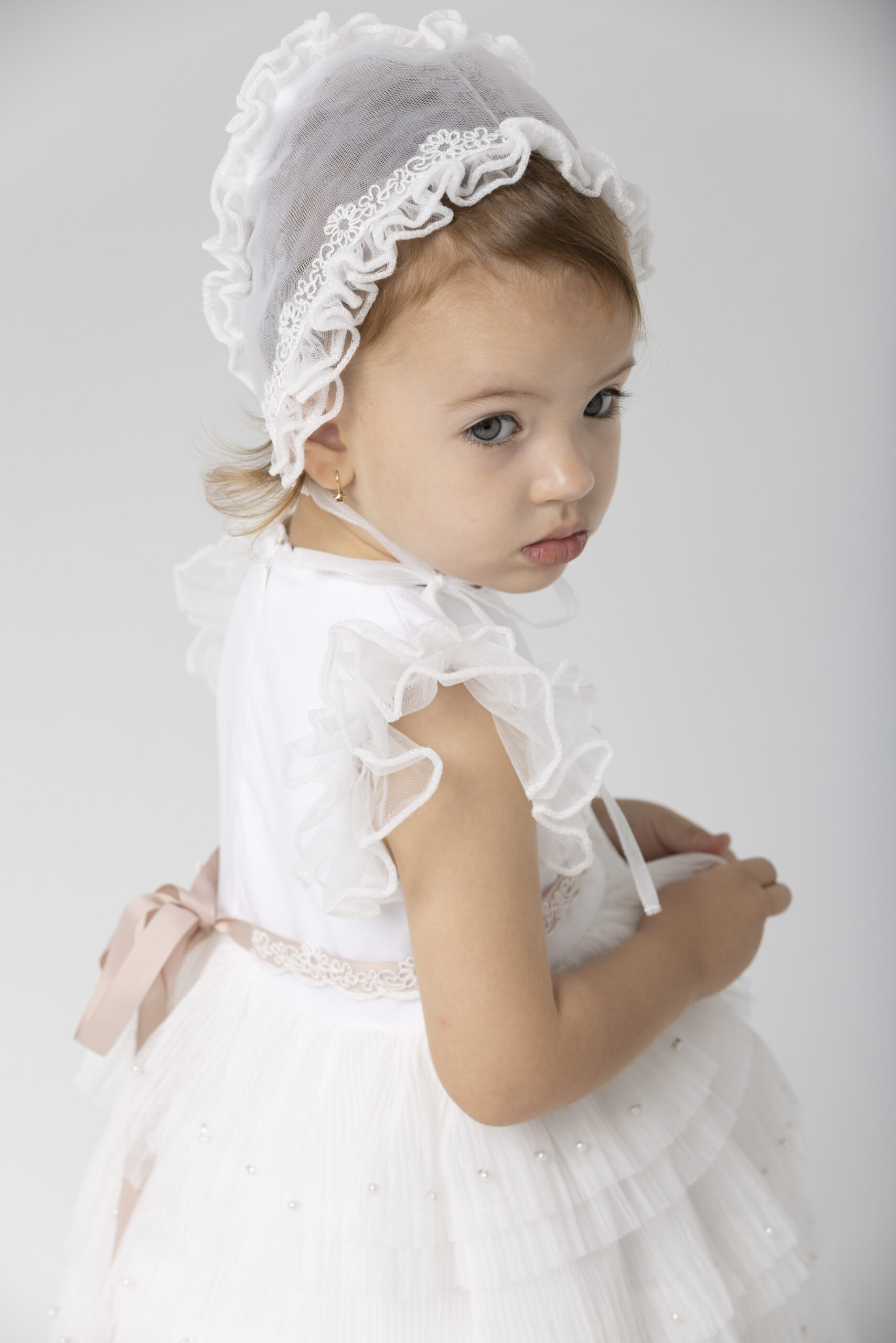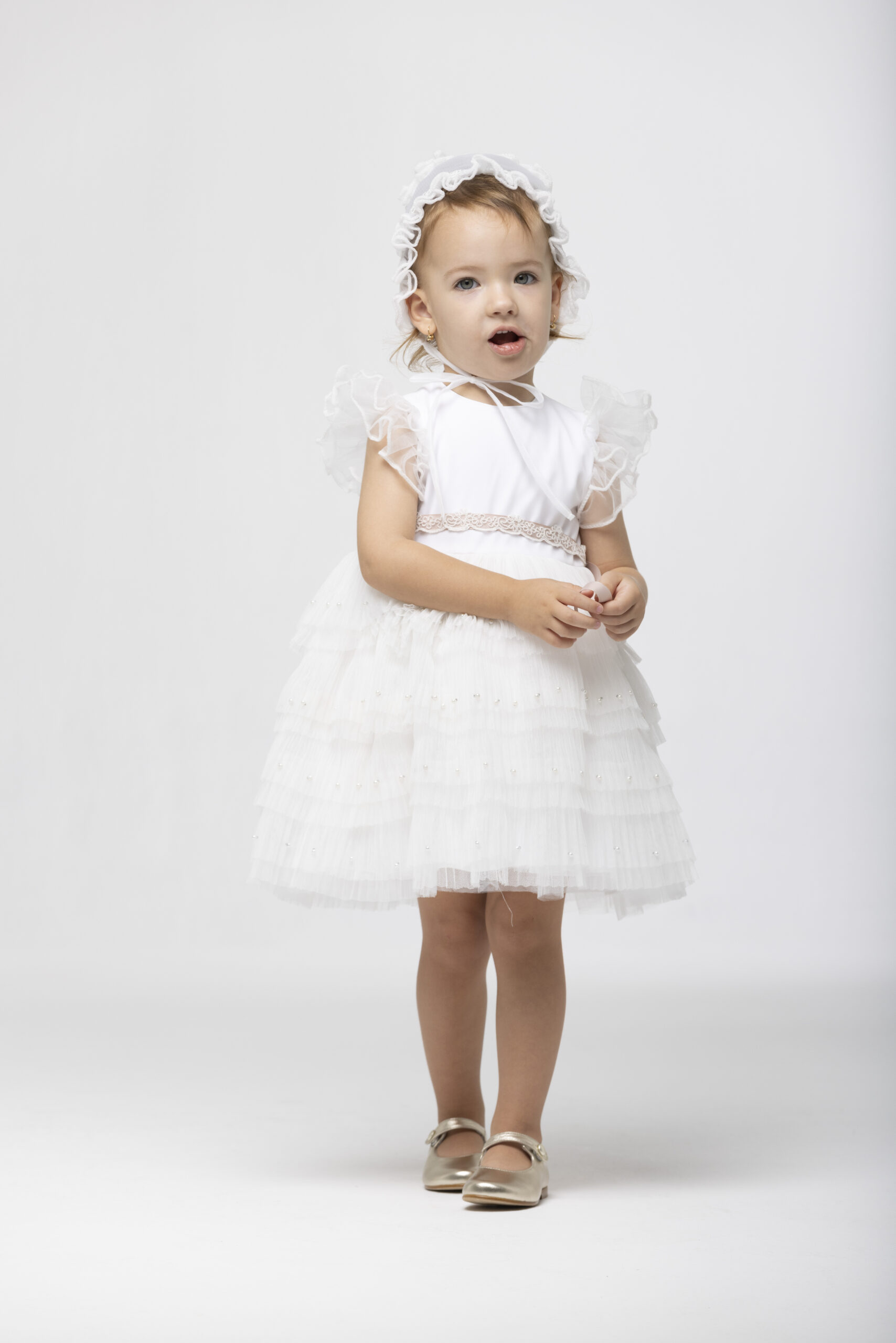 A gorgeous baby dress by Speranza. Layered tulle with pearl on skirt. It has a soft cotton lining and it fastens with a zip on the back.