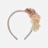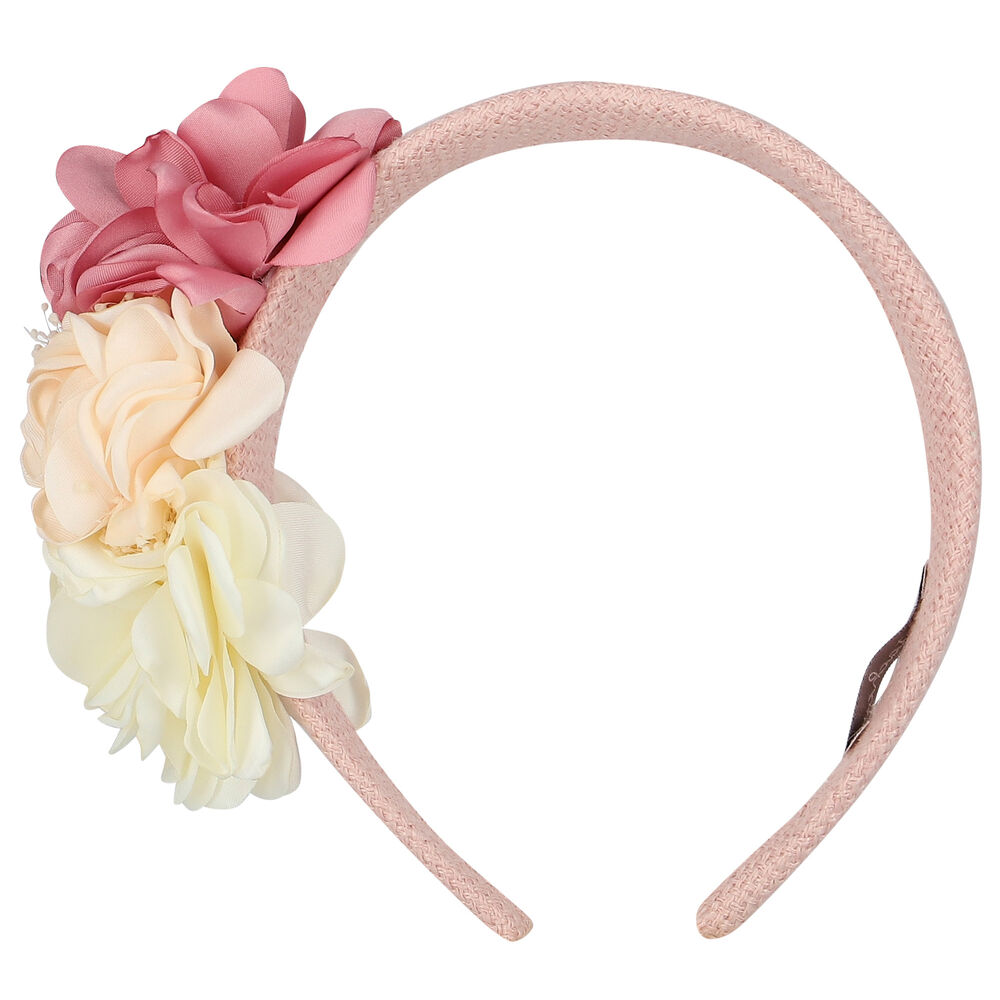 Beautiful pink hairband for girls by Portuguese brand Patachou. Features a pink tweed flexible band and it has a roses applique on the top.