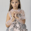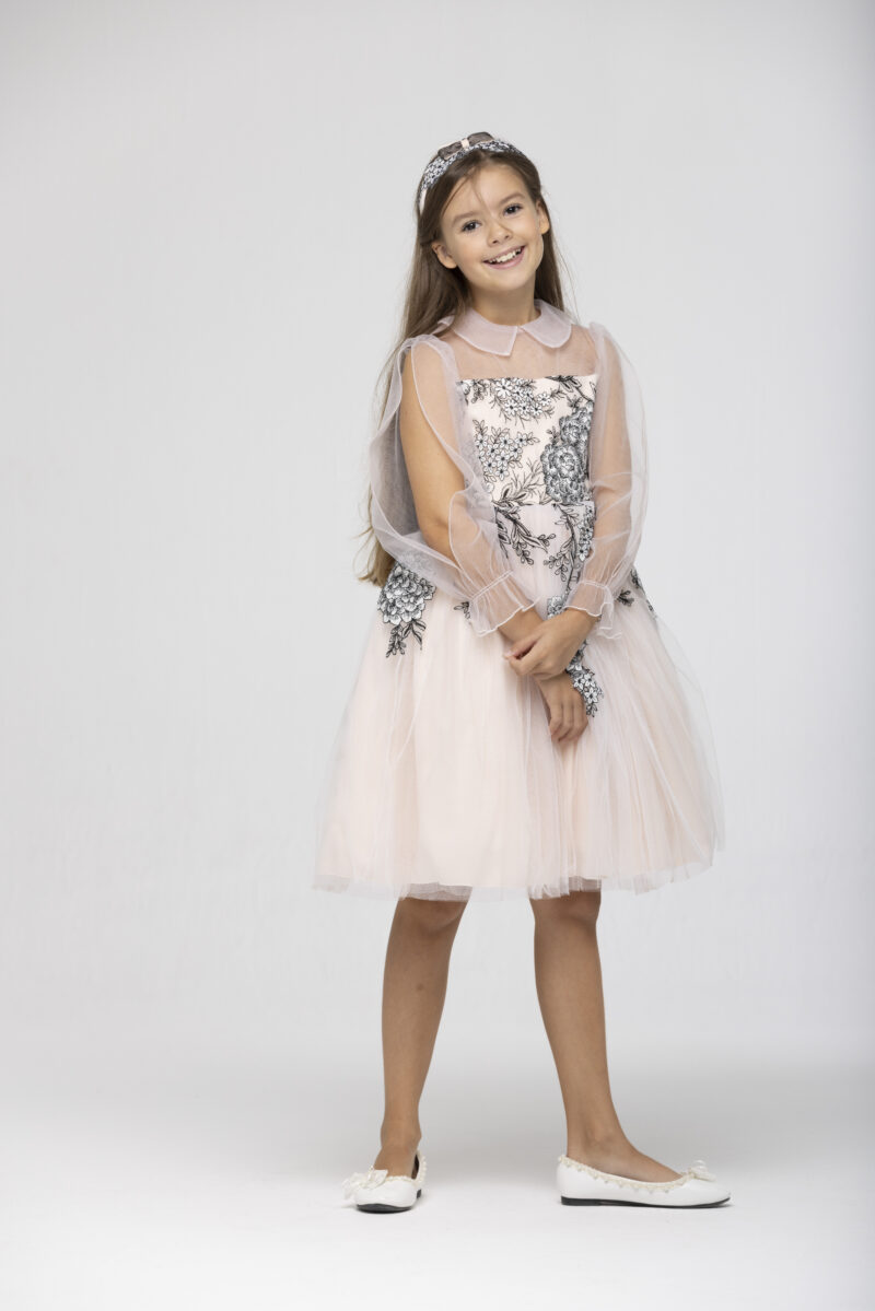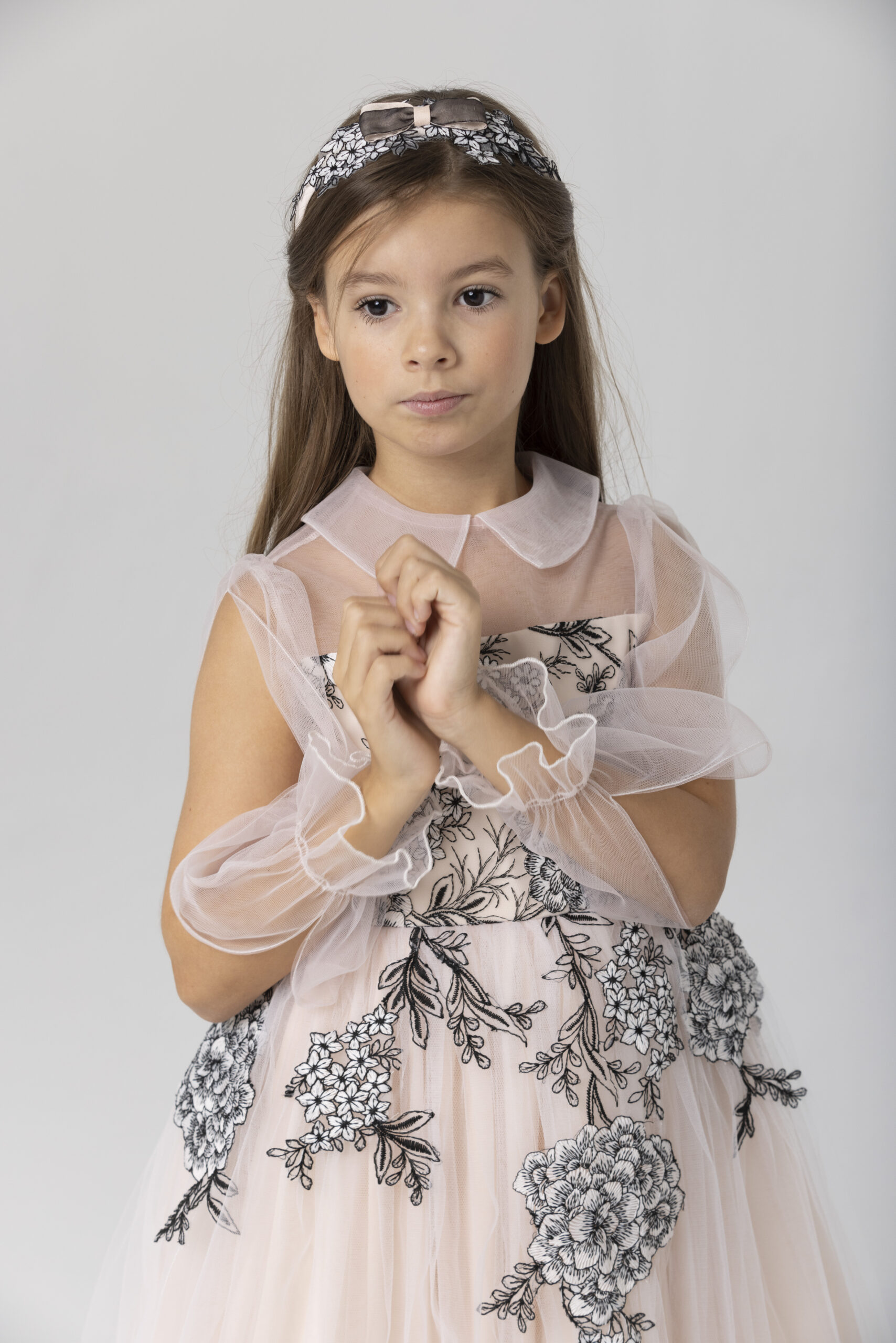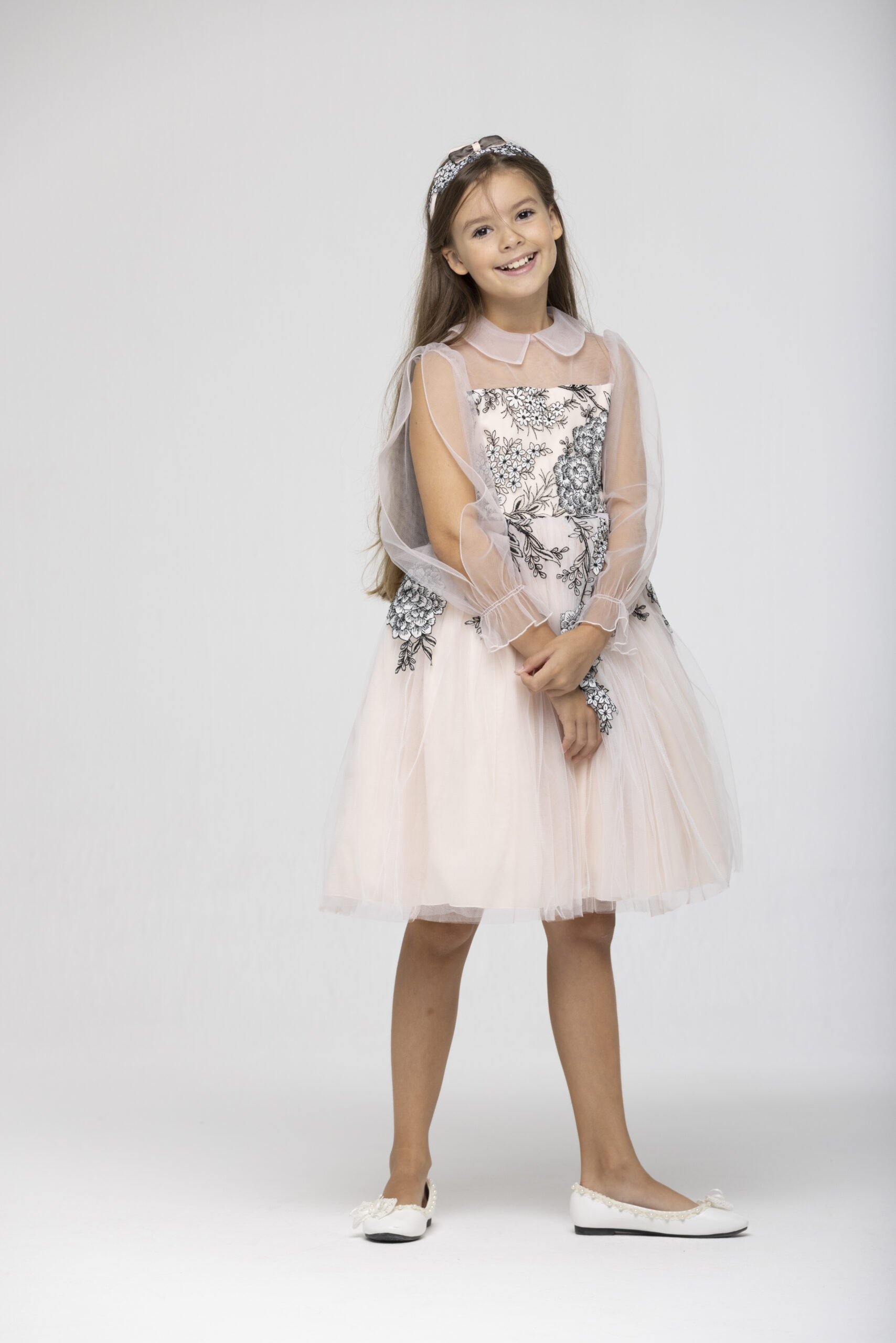 This lovely Speranza girl dress is made of embroidery organza bodice and the skirt is soft tulle in off-white. It is a long sleeve with collar.