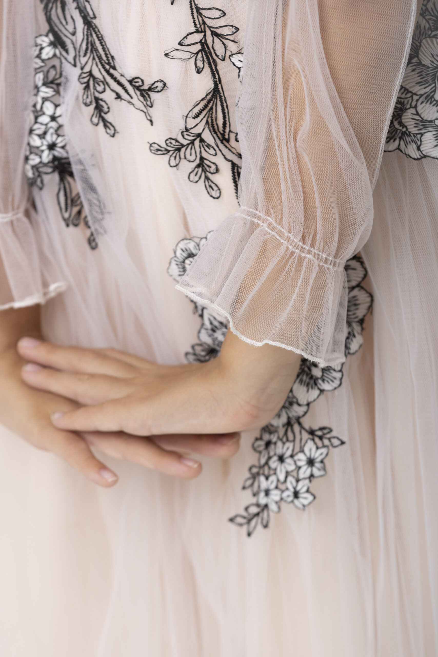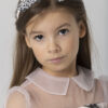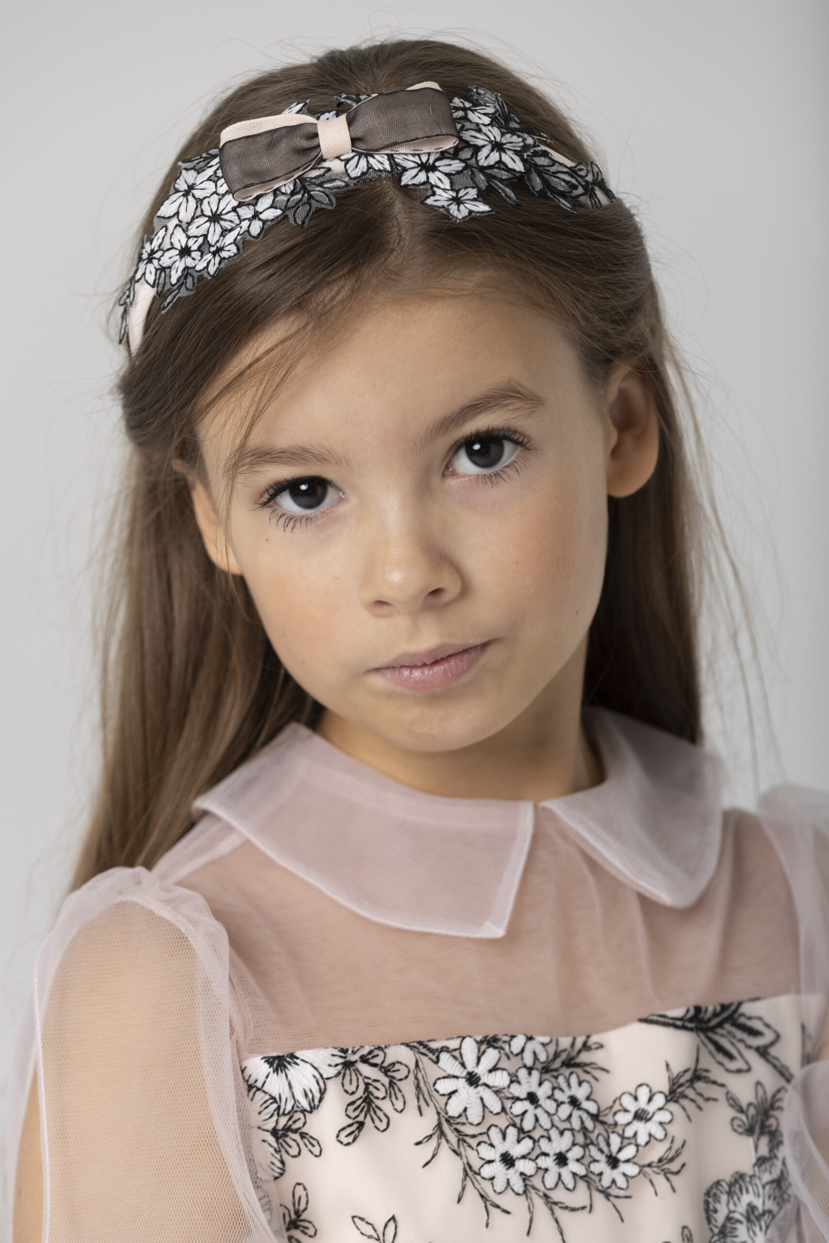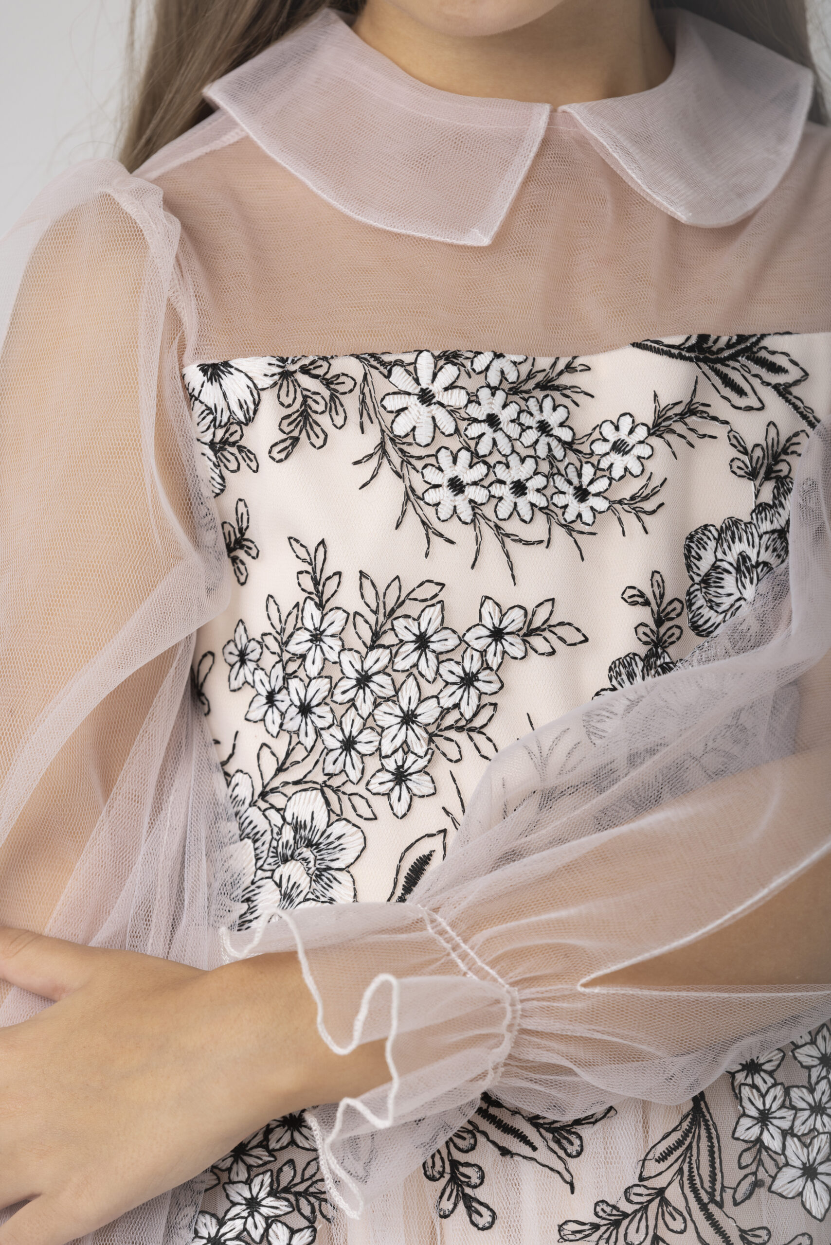 This lovely Speranza girl dress is made of embroidery organza bodice and the skirt is soft tulle in off-white. It is a long sleeve with collar.