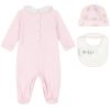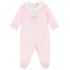 The white bib has a towelling underside, matching Marie print and a pink trims, fastens with a popper on one shoulder.