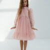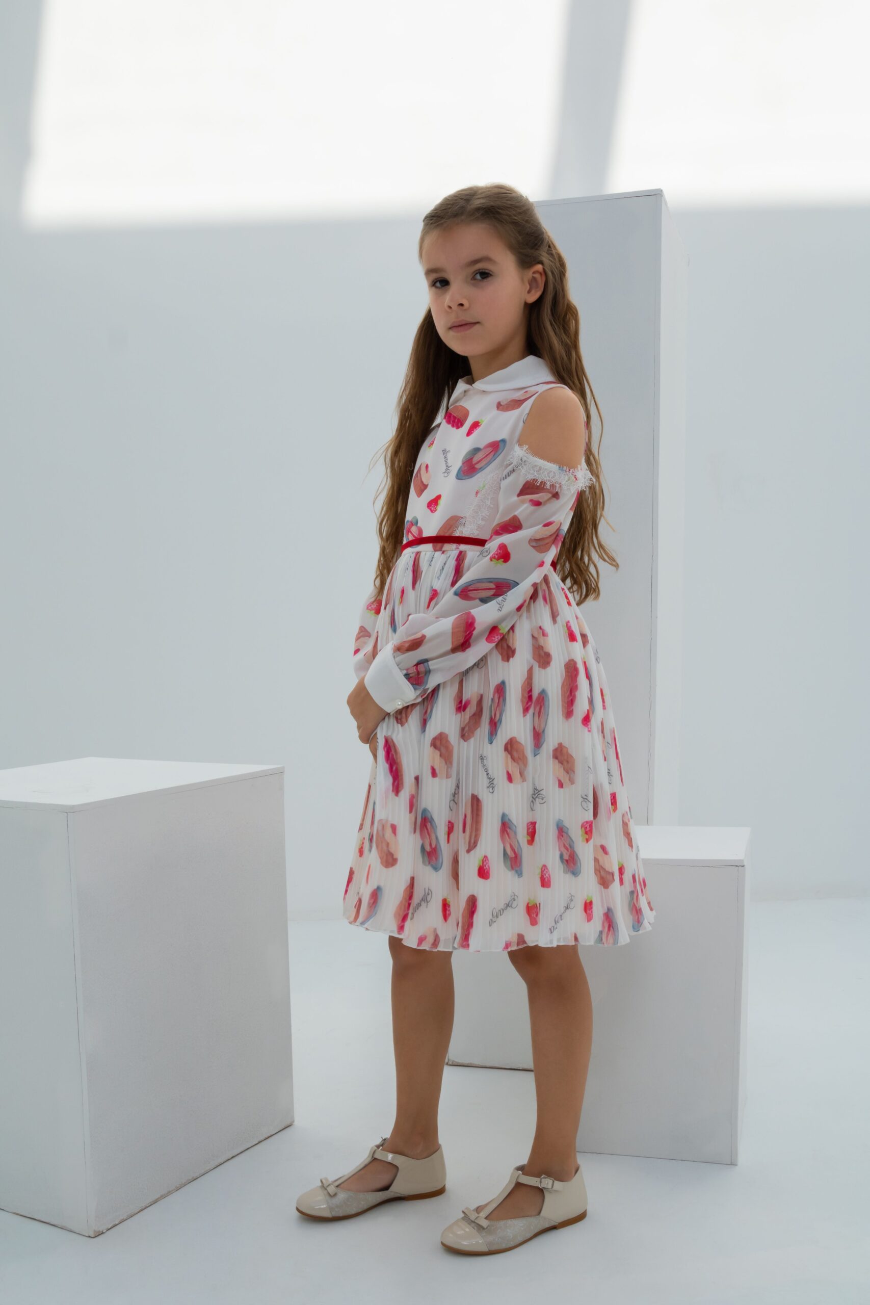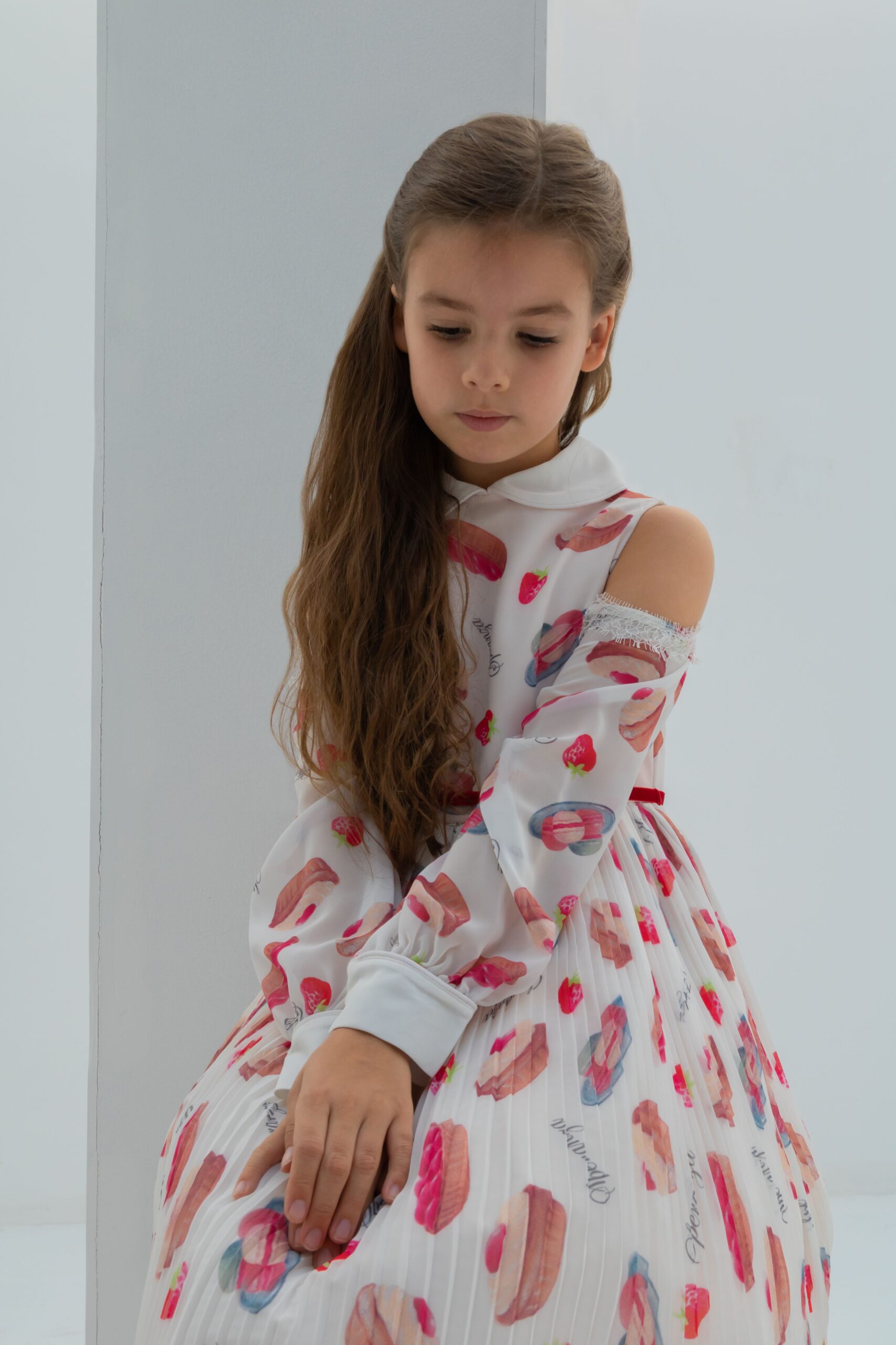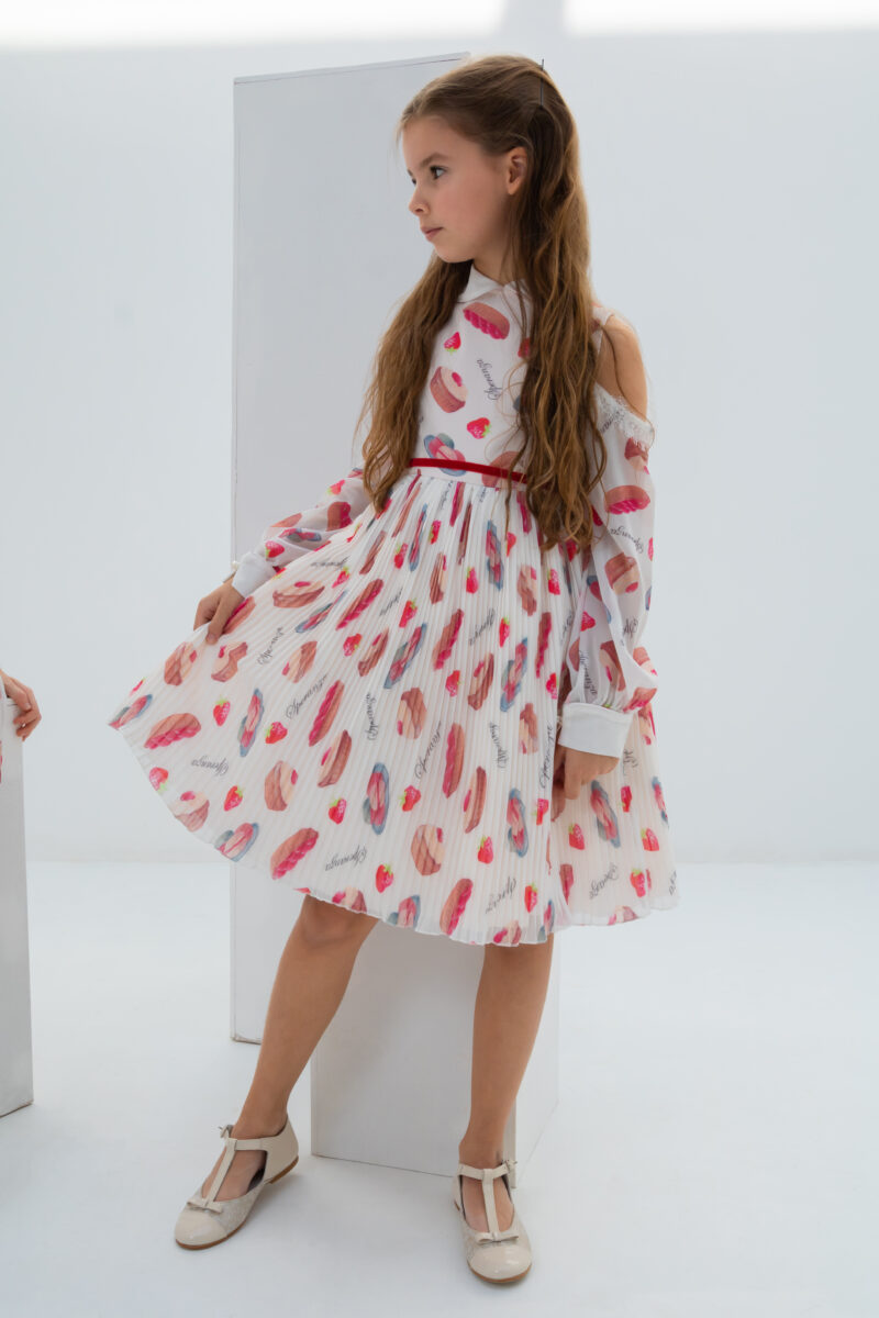 Beautiful dress of Speranza is made for your beautiful girl. A long sleeve dress with cupcake design, off white collar, pleated skirt and red ribbon belt.