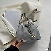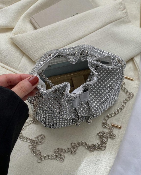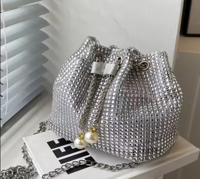 A simple and elegant bucket bag for work, with a circular design decorated with shiny rhinestones, with retractable ropes, a transparent bag featuring a modern pearl flower design, suitable for daily use, parties and special occasion. highlighting the beauty and sophistication of women, and suitable for girls and brides.