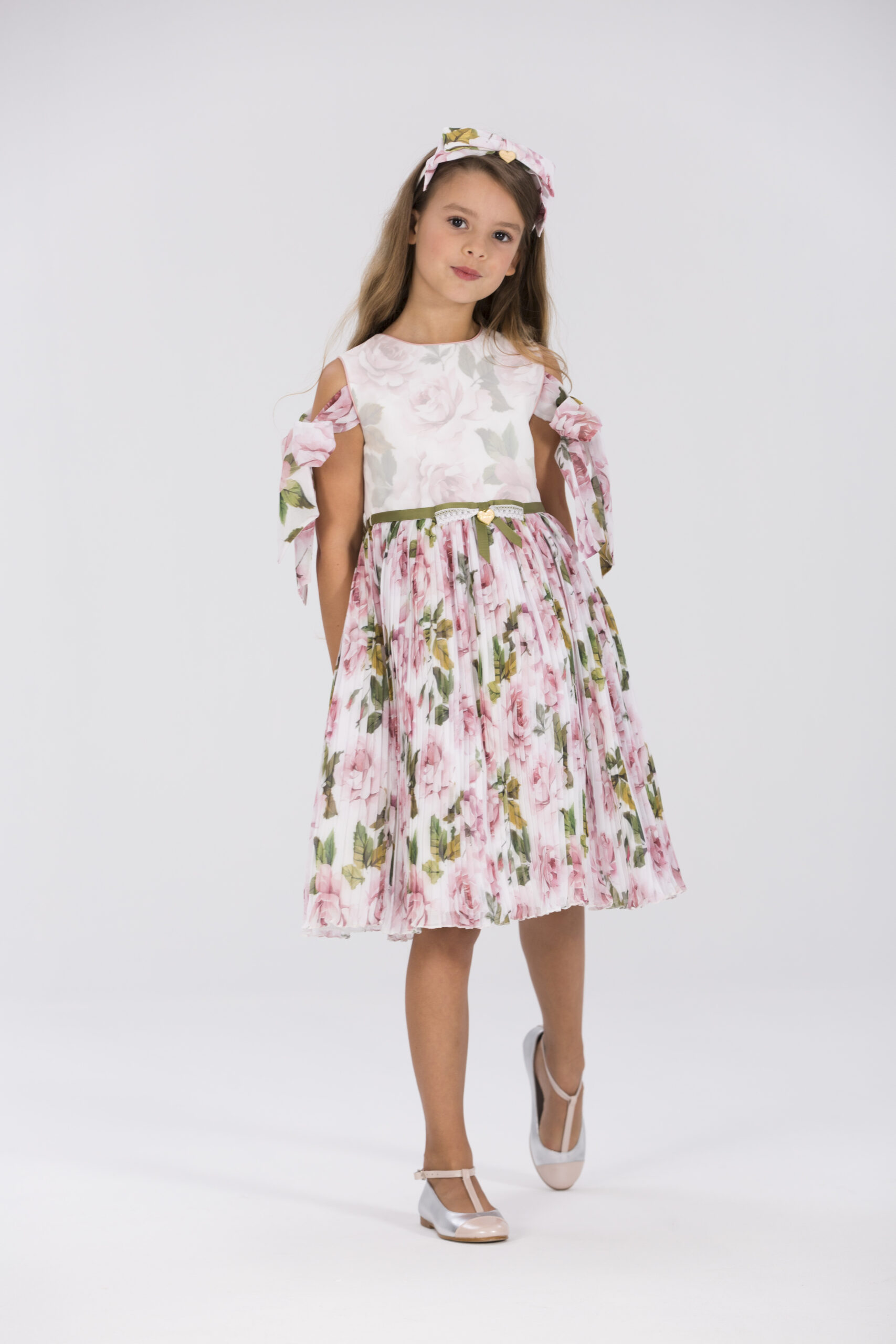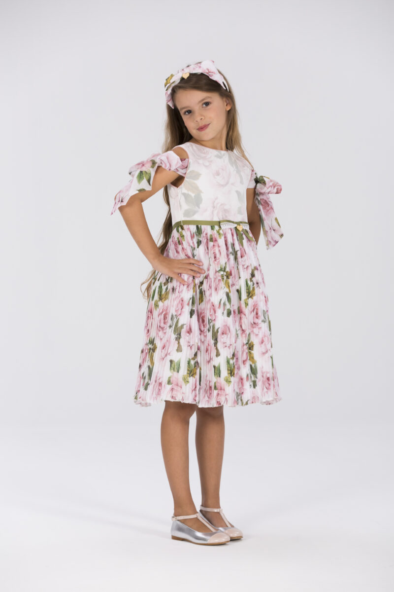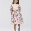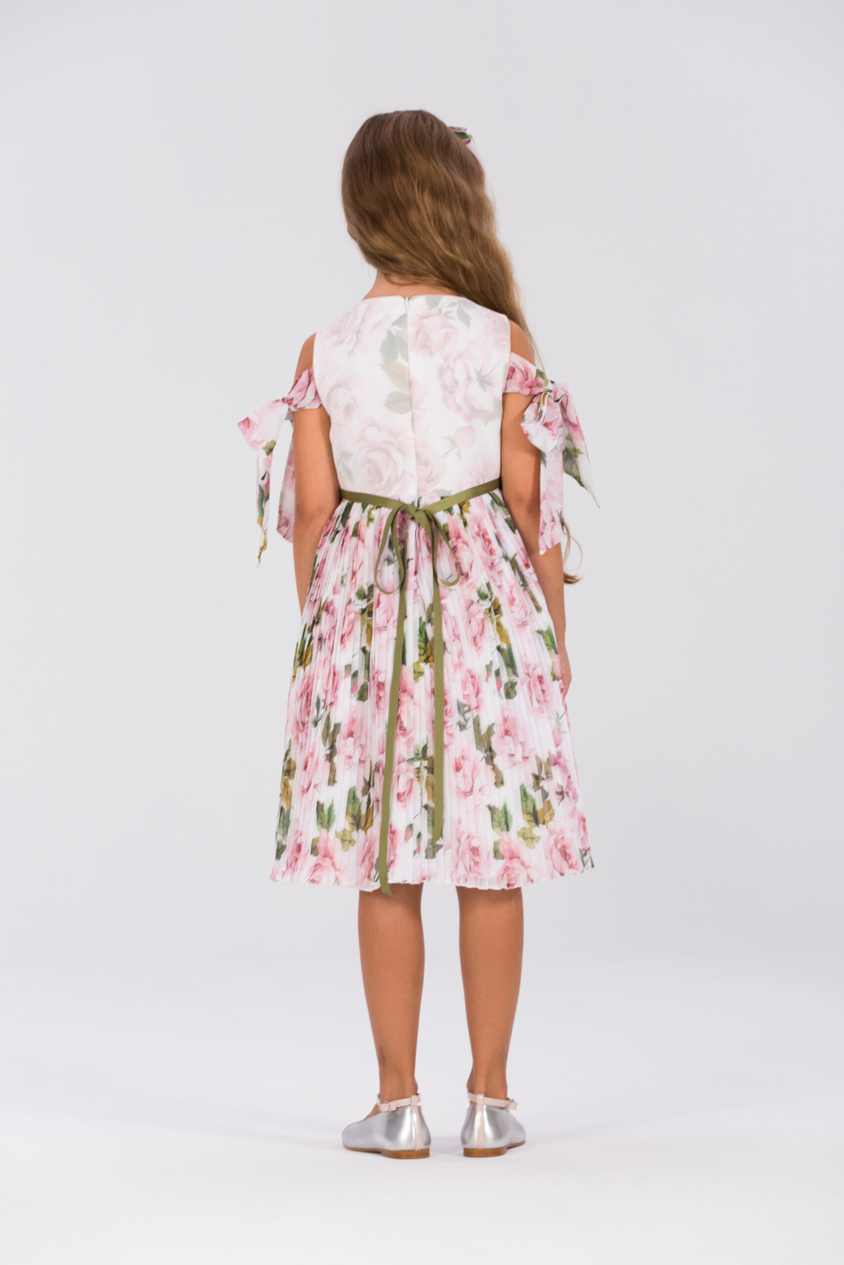This pink rose print Speranza dress is made with very soft chiffon. The detachable belt ties around the waist. The pleated skirt has a pretty flare, extra shining tulle inside to the cotton lining beneath adding volume