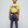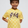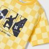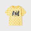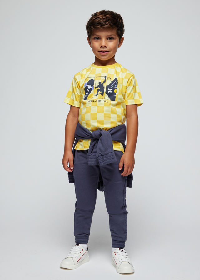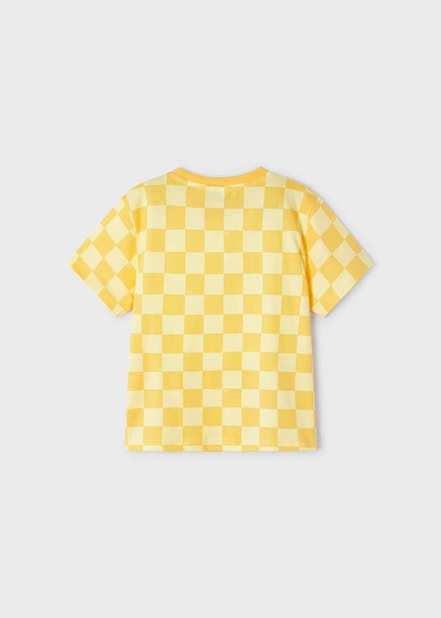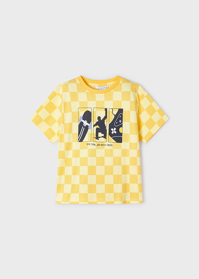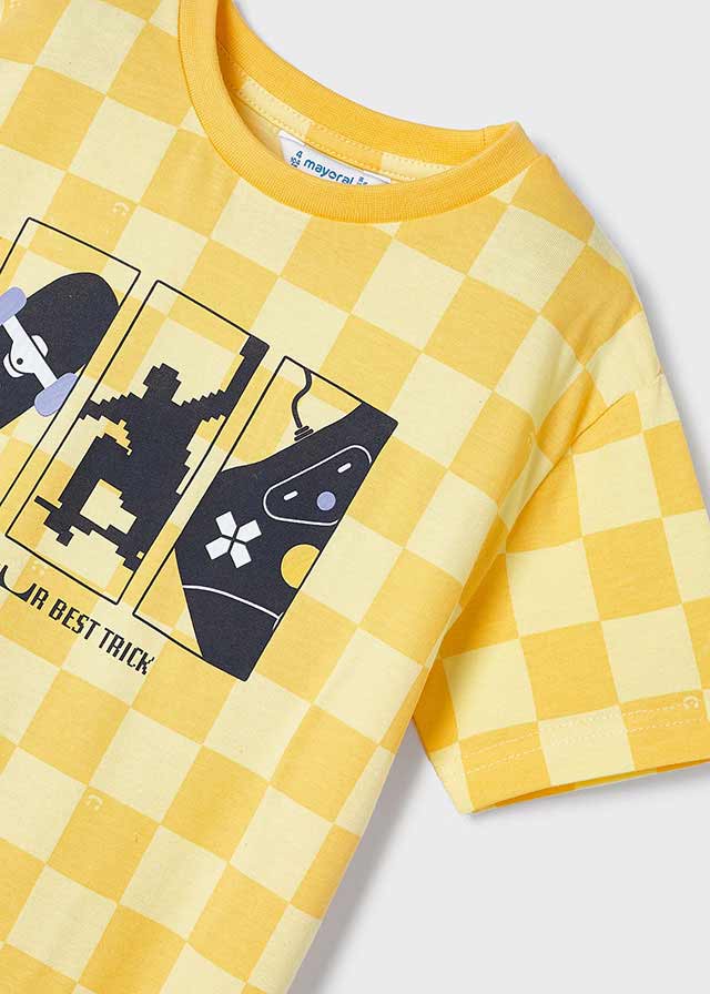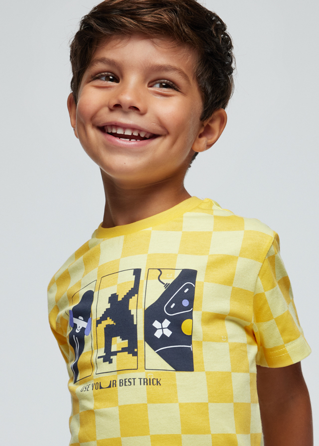 Yellow t-shirt for boys by Mayoral. Made from soft cotton jersey with all-over check pattern. It has a graphic print in navy blue, white and yellow on the chest.