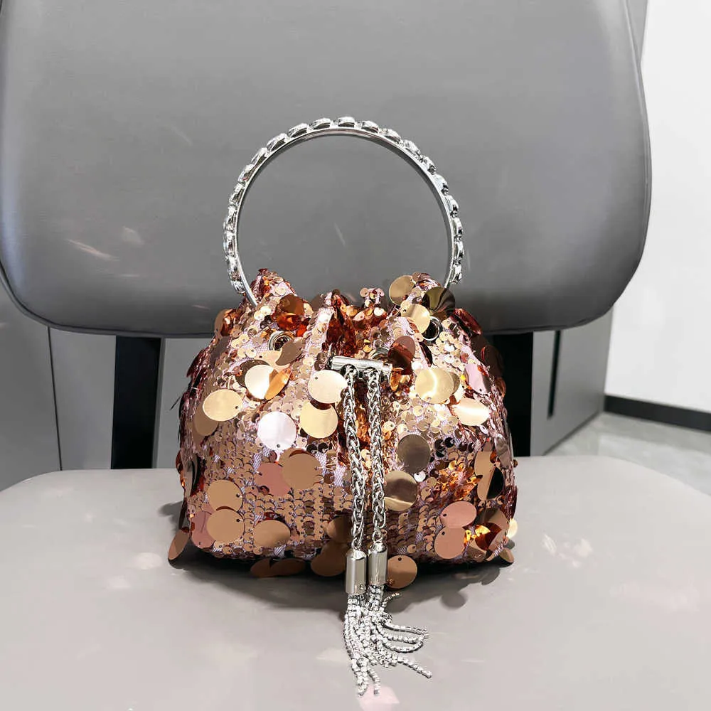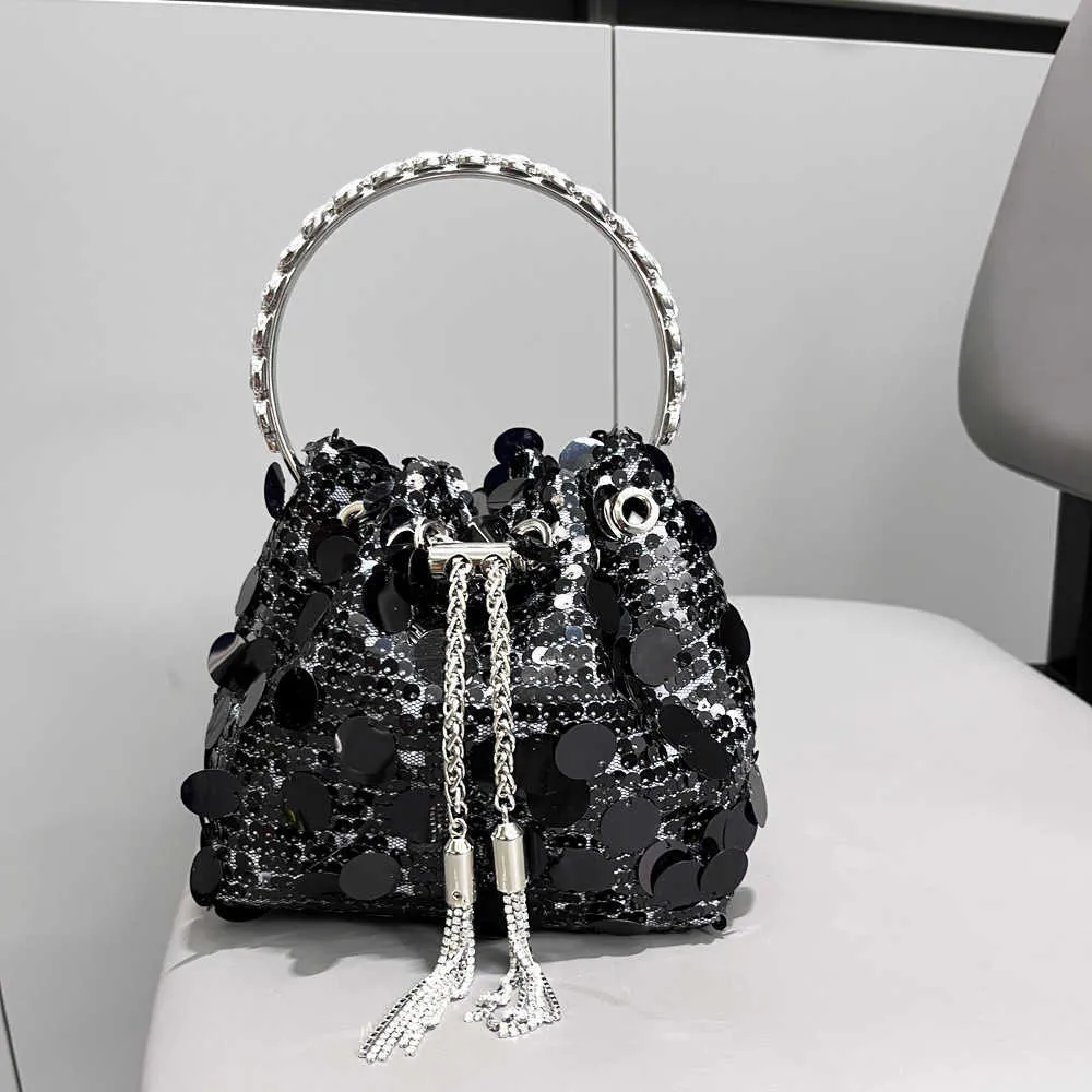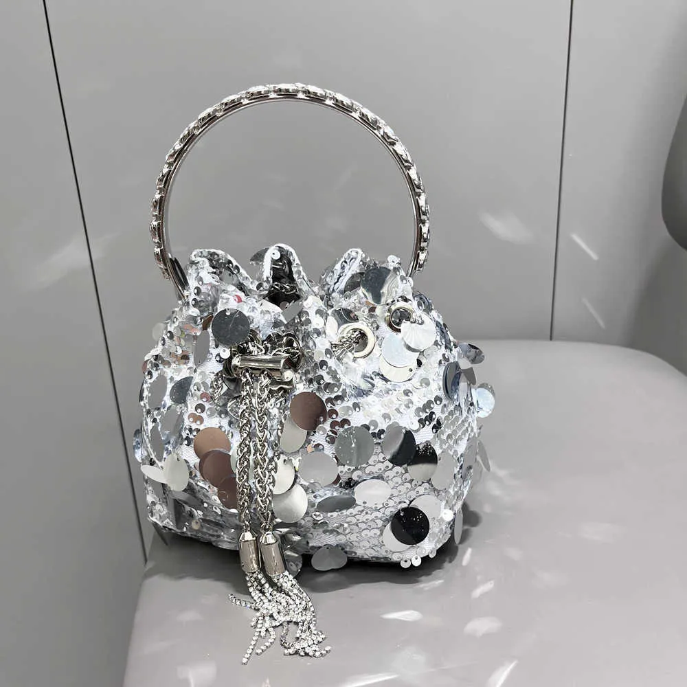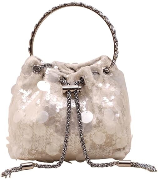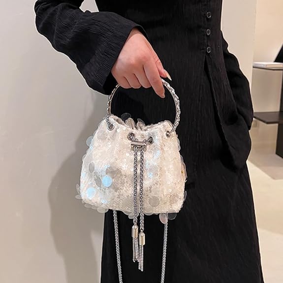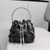 This medium-sized bucket bag features a cylindrical shape.Its streetwear-inspired style, combined with eye-catching sequin embellishments, adds an edgy and trendy touch to any outfit. It’s the perfect accessory for urban fashion enthusiasts looking to make a statement.The drawstring closure provides easy access to your belongings while ensuring their security. Made from durable and high-quality materials, it can withstand everyday use and last for a long time.
