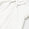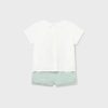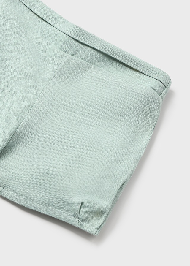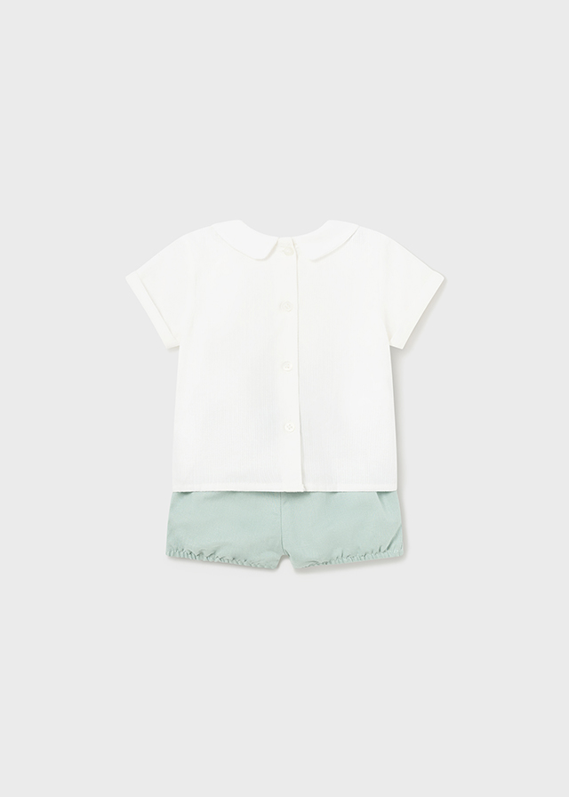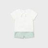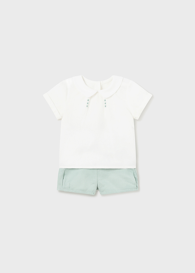 Spanish label Mayoral designs this traditional shorts set in white and jade for baby boys. Ideal for the warmer months, the shirt is woven in pure cotton and the shorts are made in breathable linen and cotton. With short sleeves, a pointed collar and jacquard tonal pinstripes, the shirt is designed with delicate embroidery on the front and classic button closures on the back. Fully lined with lightweight cotton, the smart shorts have a subtle logo tab, pleat detailing, and an elasticated waist around the back for simple dressing. The shorts contain sustainable linen.