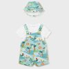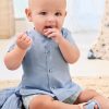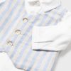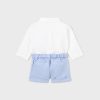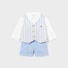 Traditionally styled blue shorts set for baby boys by Spanish brand Mayoral, made in a soft cotton and linen blend. Lovely for a smarter occasion, the ivory shirt has a striped waistcoat overlay on the front. Fastening with buttonst has adjustable-length sleeves secured with button tabs. Completing the look, the lightweight, beige shorts have turn-up cuffs and an elasticated waistband, with a button fastening on the front.