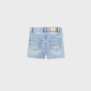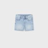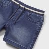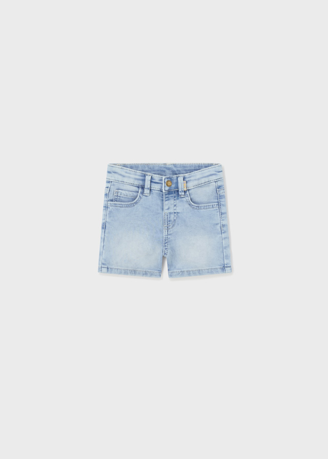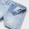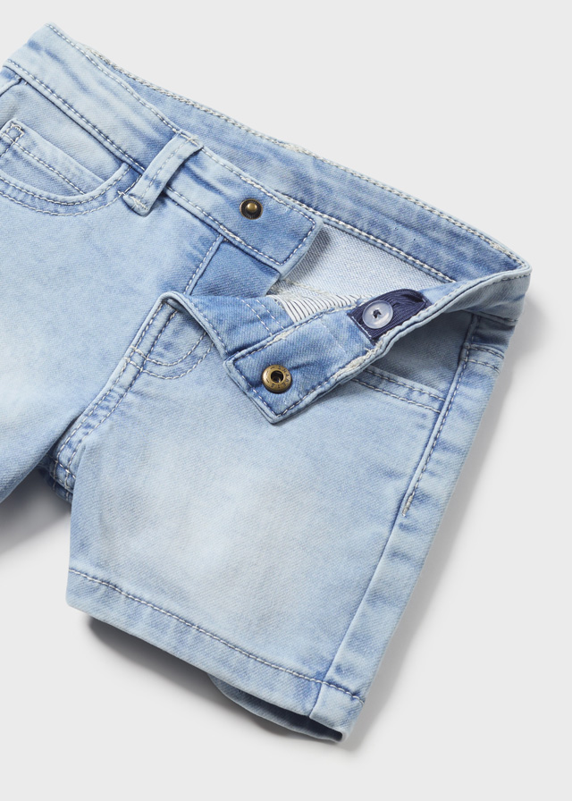 Light blue stone wash shorts for little boys by Mayoral, made in a soft cotton jersey blend with the look of denim. Comfortable for little ones, these stretchy shorts have a simple popper front and an adjustable waist for growing room. They have five-pocket styling with contrast stitching on the seams. There is a jacron patch positioned on the back of the waistband that features a cut-out logo design. This item contains recycled fibres.