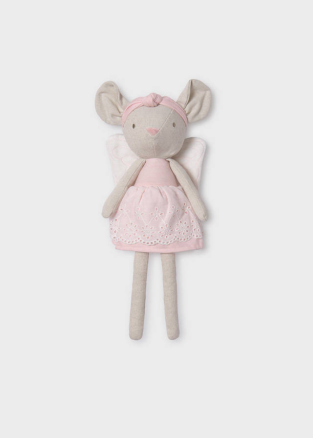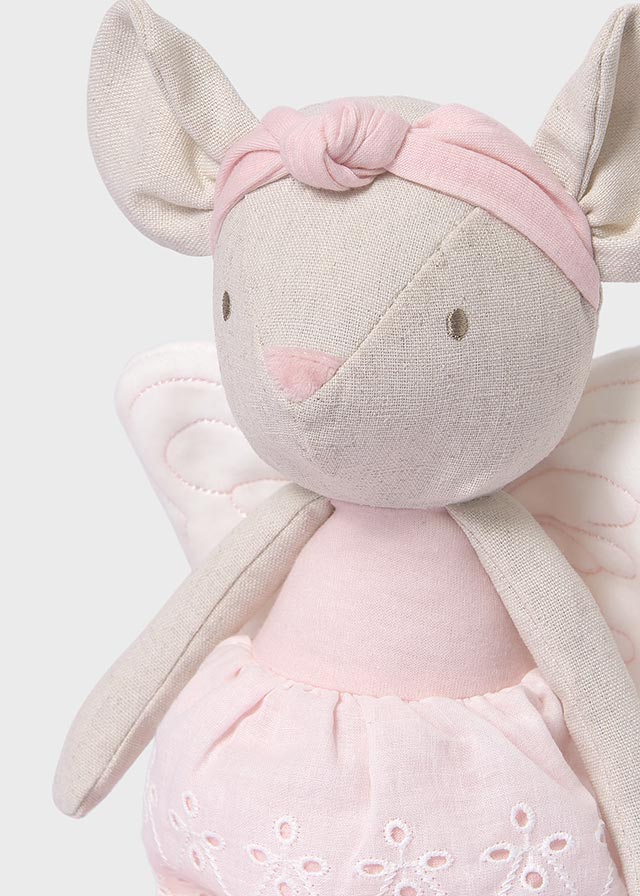 A beige and pink mouse soft toy for girls by Mayoral, made in softly woven cotton-blend fabric. This pretty ballerina is wearing a broderie anglaise skirt with padded velour fairy wings, easy for little hands to cuddle and play with.