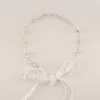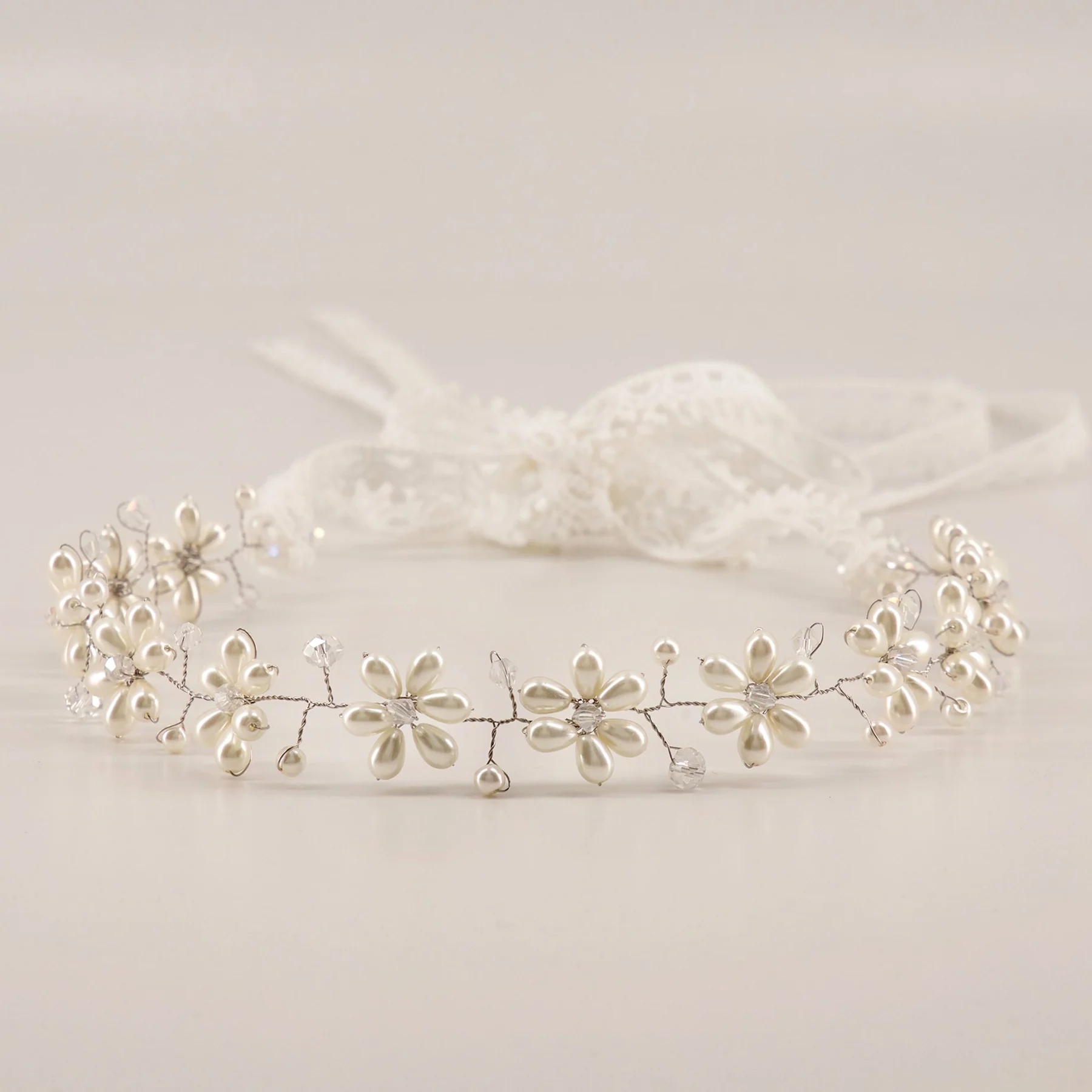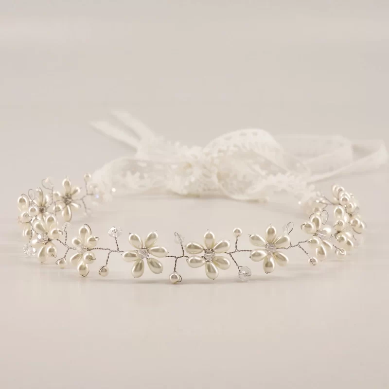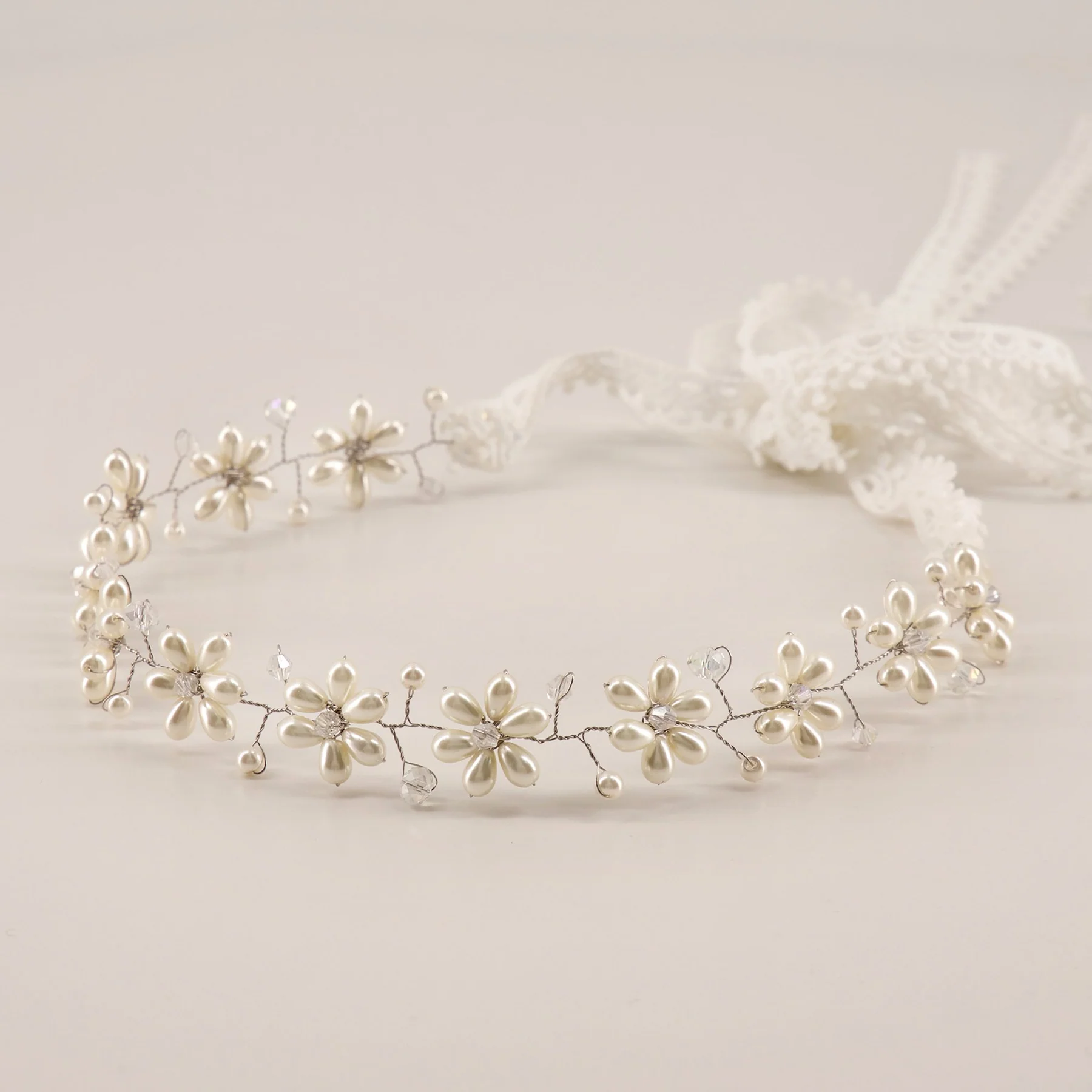 This is a stunning designer flower hair garland for girls that is perfect for a flower girl or special occasion outfit. The garland itself is completely handmade and adorned with hand-crafted pearl daisy flowers. In the center of each flower is a sparkling clear-cut crystal bead.the hair garland is fastened with two rows of soft white lace to make it completely adjustable. This style comes with its own Sienna Likes to Party branded drawstring pouch for safekeeping.