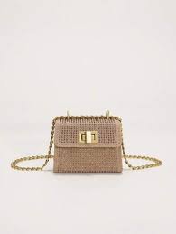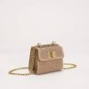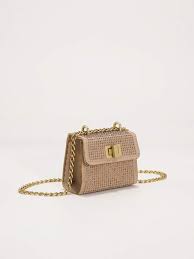 Mini bag in leather and suede fabric in Sand color (nude) with hotfix application in crystal tone . The small-shaped piece has a long gold chain strap .