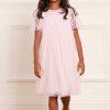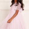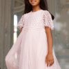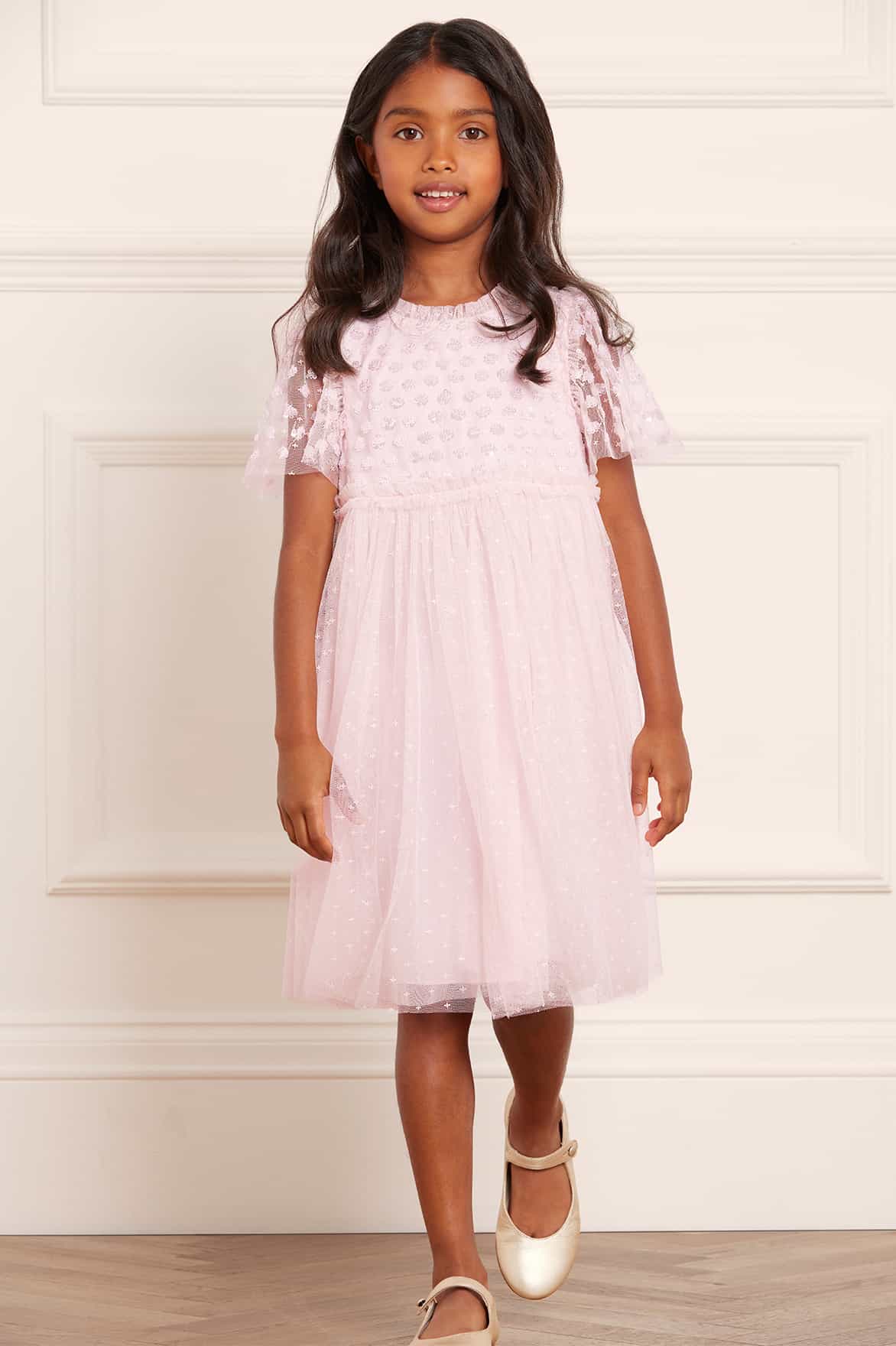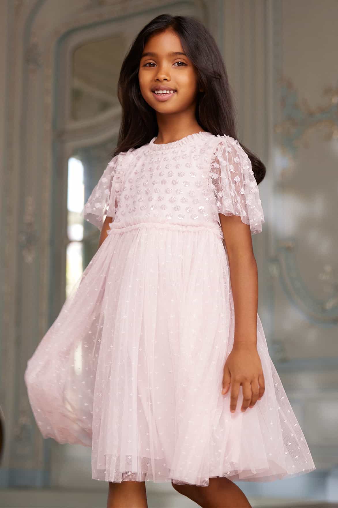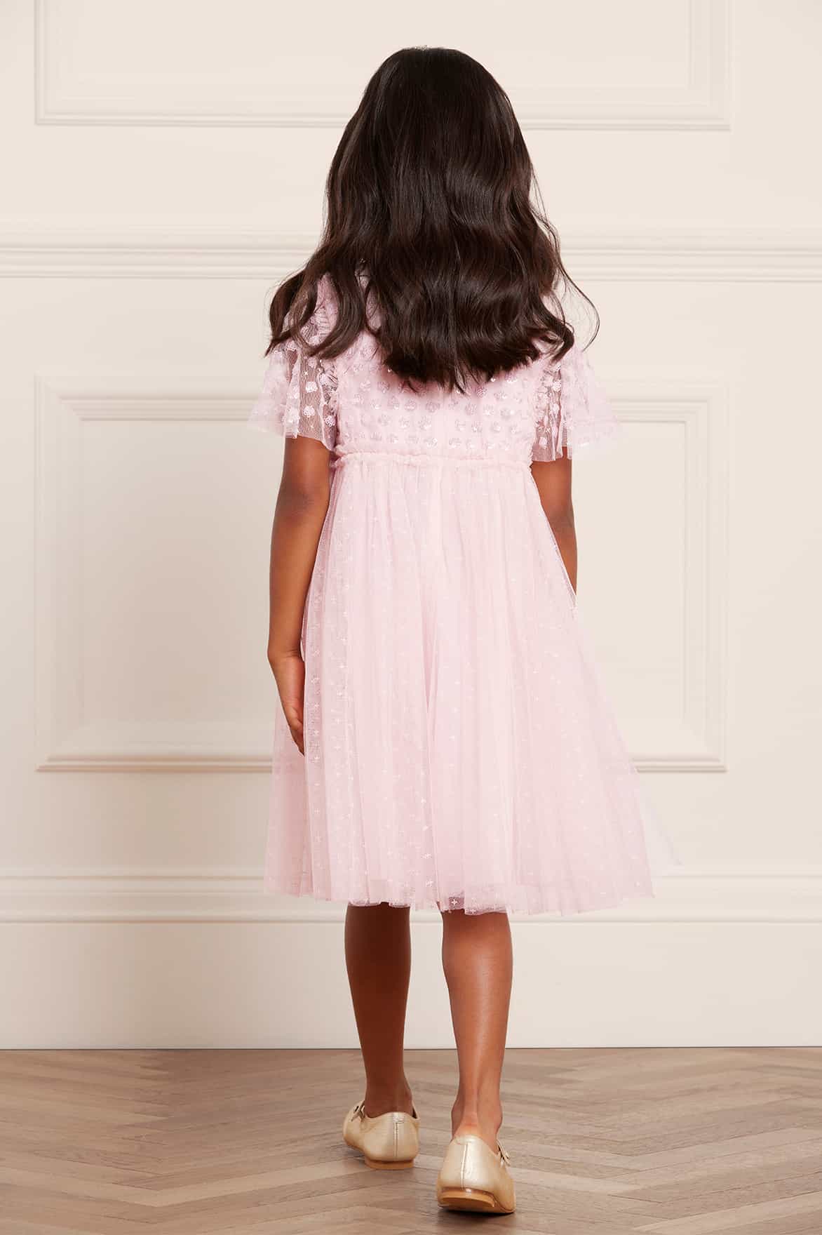 The Thea Bodice KIDS Dress in Peony. The bodice of this dress is beautifully adorned with sequin dot motifs creating a playful, shimmering effect. Designed with a signature Needle & Thread skirt, made with layers of frothy tulle. The perfect dress for an upcoming special occasion.