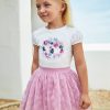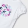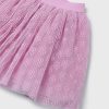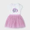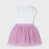 White and mauve pink skirt set for girls from Spanish label Mayoral. With purple, blue and gold accents, the short-sleeved T-shirt is beautifully decorated with printed, embroidered and sequinned flowers for a sweet look. The feminine capped sleeves are designed with a slight puff effect.The tutu-style skirt is made in delicate floral print tulle plissé and lined with comfortable cotton. The elasticated waist ensures lasting comfort.