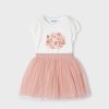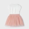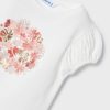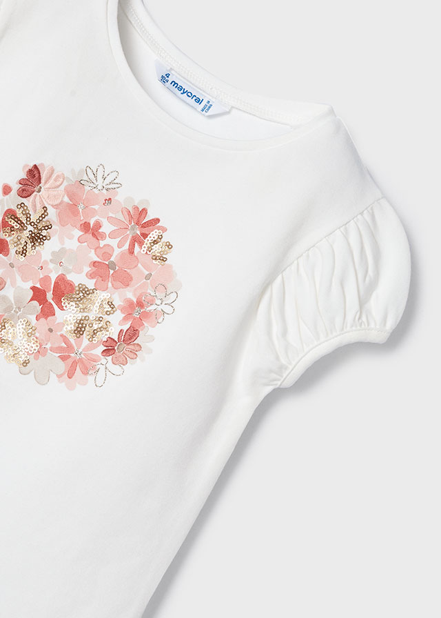 White and mauve pink skirt set for girls from Spanish label Mayoral. With purple, blue and gold accents, the short-sleeved T-shirt is beautifully decorated with printed, embroidered and sequinned flowers for a sweet look. The feminine capped sleeves are designed with a slight puff effect.The tutu-style skirt is made in delicate floral print tulle plissé and lined with comfortable cotton. The elasticated waist ensures lasting comfort.