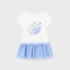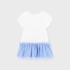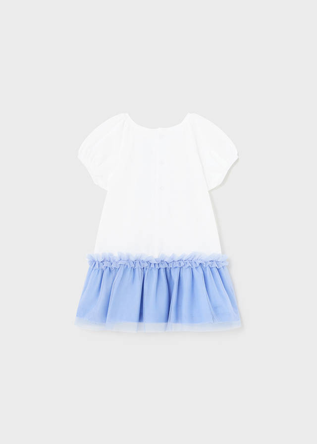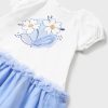 A white and blue dress for little girls designed by Mayoral, made in super-soft cotton jersey. Sweet and girly, a dainty floral motif is printed on the front, with glitter details and tulle accents. The short sleeves have elasticated cuffs, creating a lovely puffed effect. The cornflower blue skirt is layered with a pretty tulle ruffle overlay for added flounce. It fastens with easy-to-use poppers on the back for simple dressing.